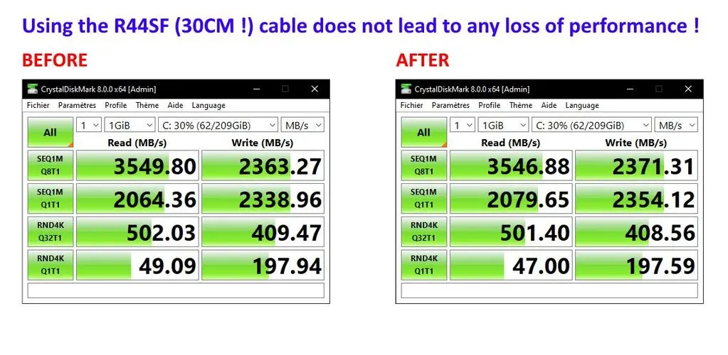 The use of the R44SF cable (length 30CM) does not lead to any loss of performance. ----- The combination with a simple passive radiator - but effective in size - gives an excellent result well beyond what I expected! ----- Before I had a small heatsink with a fan plugged in which gave the same result by unplugging the fan. : \ ----- Idle 36/38 ° c and at full load 57/58 ° c ----- ----- Now - with this large passive radiator but very efficient by its container, added to the displacement of the Samsung 970EVO PLUS with the cable, I am in 28/33 in idle but ESPECIALLY in full load of intensive writes at 39/42 ° C !! !! ----- Much better than I expected! -----