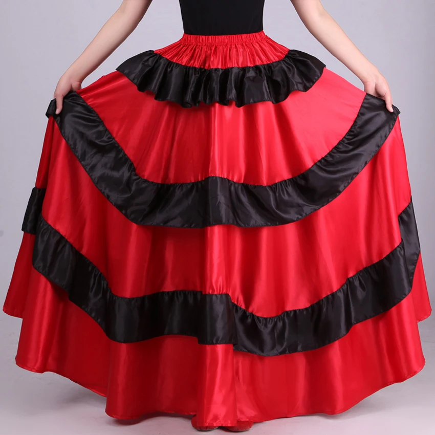 Для взрослых детей Цыганские девушки женщины испанский Фламенко юбка полосатый атласный шелк большие качели живота танцы красная юбка команда представление