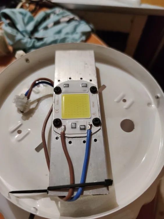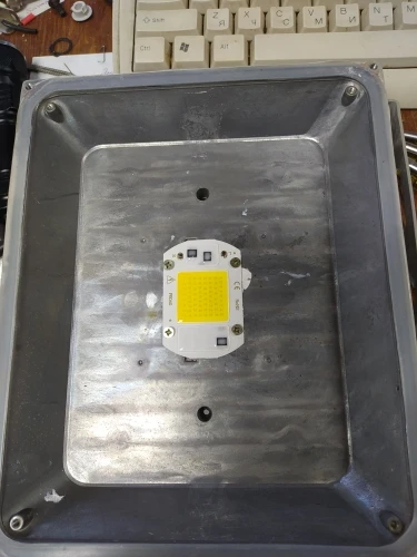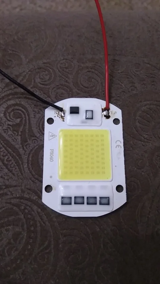 Все как и ожидалось - провода припаял, радиатор прицепил (ОБЯЗАТЕЛЬНО), и сразу в бой! Есть нюансы! При нагреве начинает проседать напряжение! Если при старте мы имеем 30Вт, то после десяти минут работы, радиатор нагревается до 90 градусов, а сила тока падает до 10Вт, соответственно, и яркость тоже падает. Охладите радиатор и он снова "разгорится". Имейте ввиду, лампа очень сильно моргает, на фото видно. Глазами не видно, но на глаза все равно будет действовать. Использовать только на улице, хоз назначение.