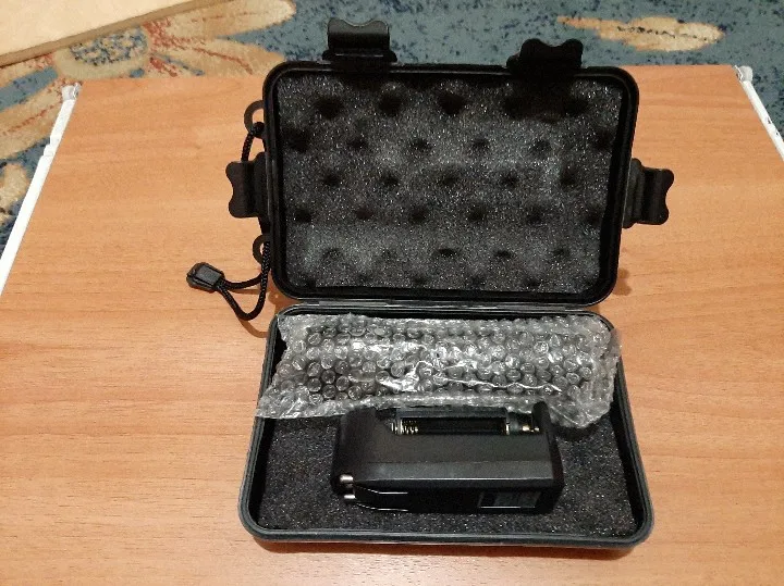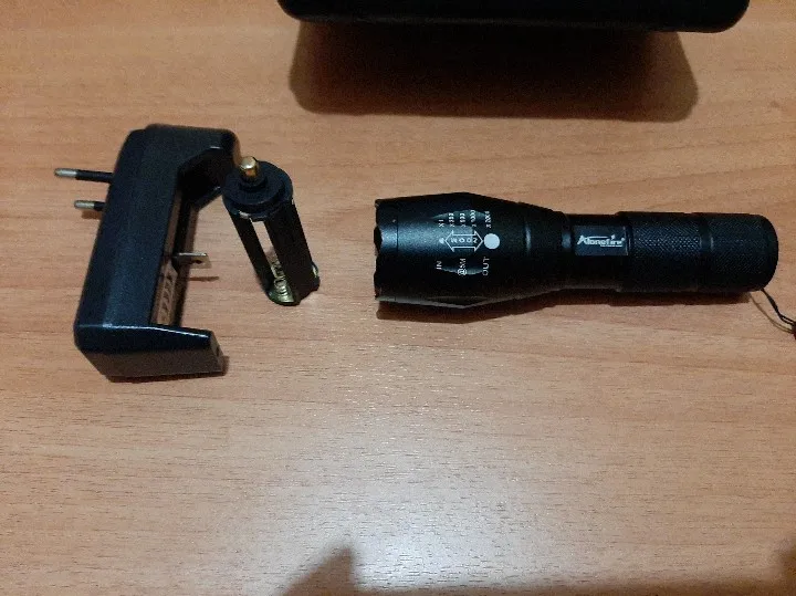 Посылка очень долго шла. Но, фонарик того стоит! Мощно светит всеми четырьмя цветами, крепкий, металлический, массивный, чувствуется вес, при имеющихся навыках можно использовать при самообороне. Цвета можно переключать без выключения, коротким нажатием на кнопку. Кейс хорошо упакован в пупырку, у зарядки складная вилка, адаптер на 3 батарейки AAA, аккумулятор 3.7 V, адаптер для него, кейс. У фонарика есть зум, линза откручивается, можно сменить. Всё отлично выглядит и работает! Спасибо продавцу! Рекомендую к покупке!