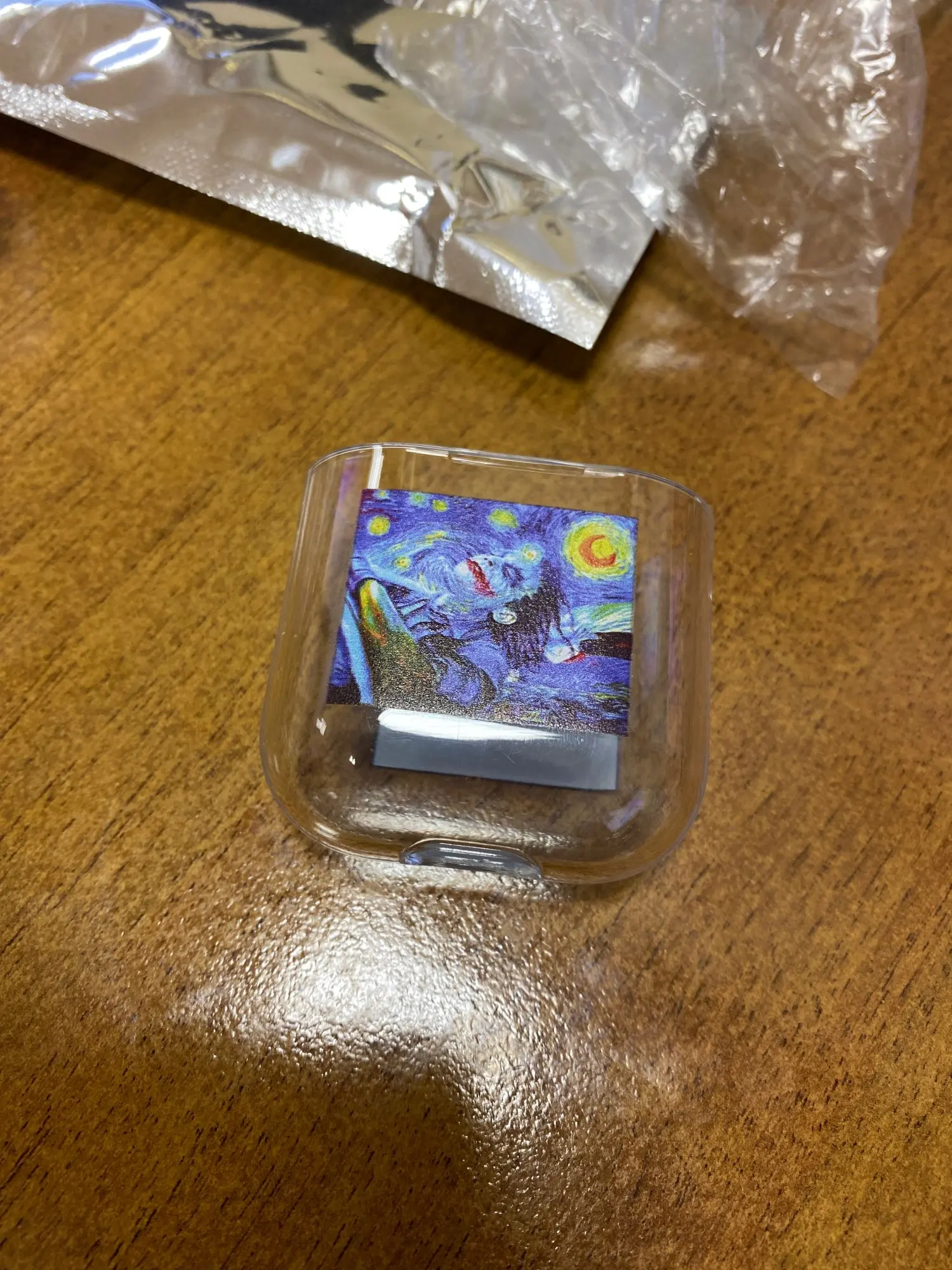 Чехол немного свободный на наушниках ( первая версия ). Не бойтесь, наушники не застрянут везвылазно в чехле. Сделано из пластика. Наклейка хорошая. Корпус с крышкой раздельно
