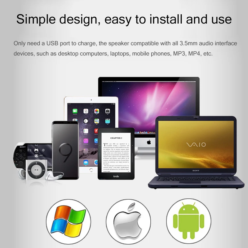 Нужен только порт USB для зарядки, динамик совместим со всеми устройствами с аудиоинтерфейсом 3,5 мм, такими как настольные компьютеры, ноутбуки, мобильные телефоны, MP3, MP4 и т. Д.