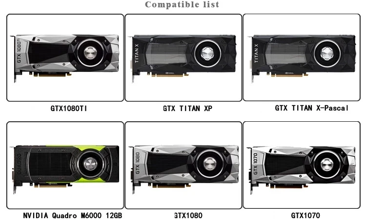Совместимость (Включая, но не ограничиваясь следующими моделями)Версия TITAN XPПубличная версия TITAN X-PascalОткрытая версия GTX 1070/1080/1080TIEVGA GTX 1070/1080/1080Ti основатели изданиеZOTAC GTX 1080/1080TI основатели изданиеInno 3D ICHILL GTX 1080TI X4 ULTRAMSI GTX1080TI AERO 11GManli Gallardo GTX1080TI