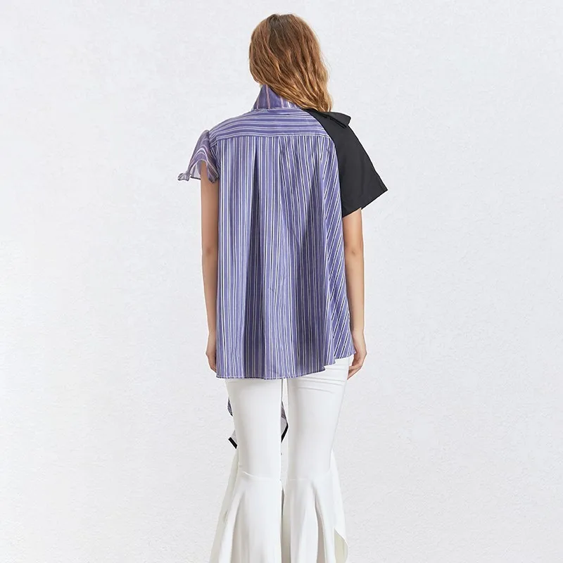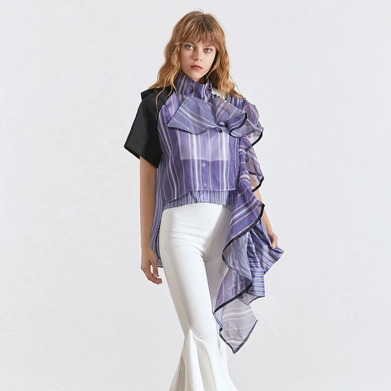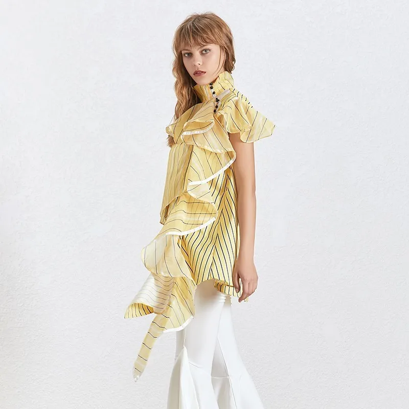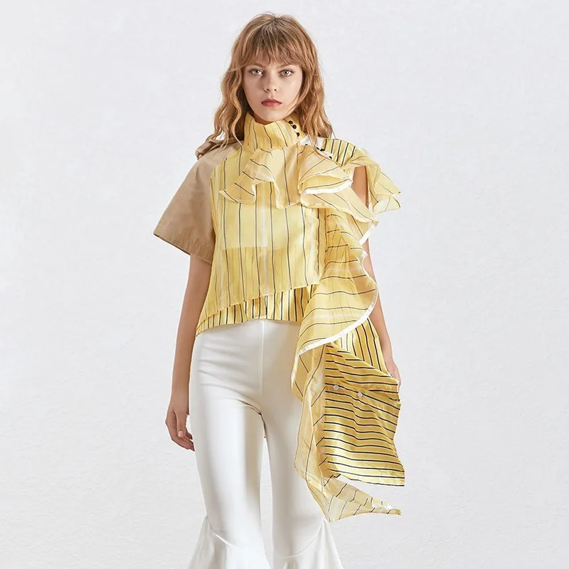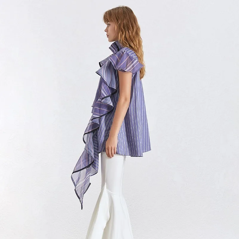 Женская Асимметричная блузка TWOTWINSTYLE, летняя блузка в полоску с оборками, воротником-стойкой и коротким рукавом, 2020