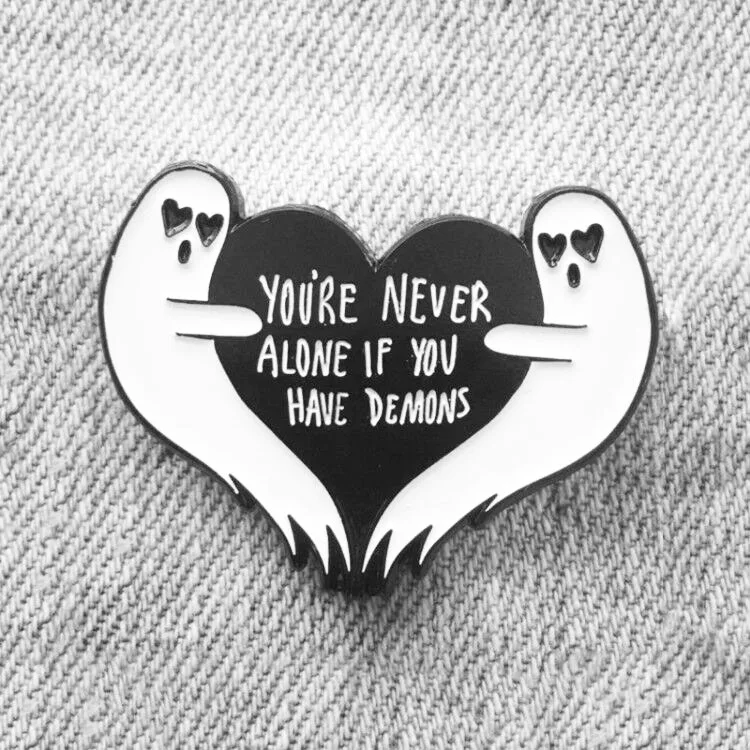 Значки с героями мультфильмов буквы YOU'RE NEVER ALONE если у вас есть демоны Броши для женщин призрак сердце булавки ювелирные изделия эмаль булавки аксессуары