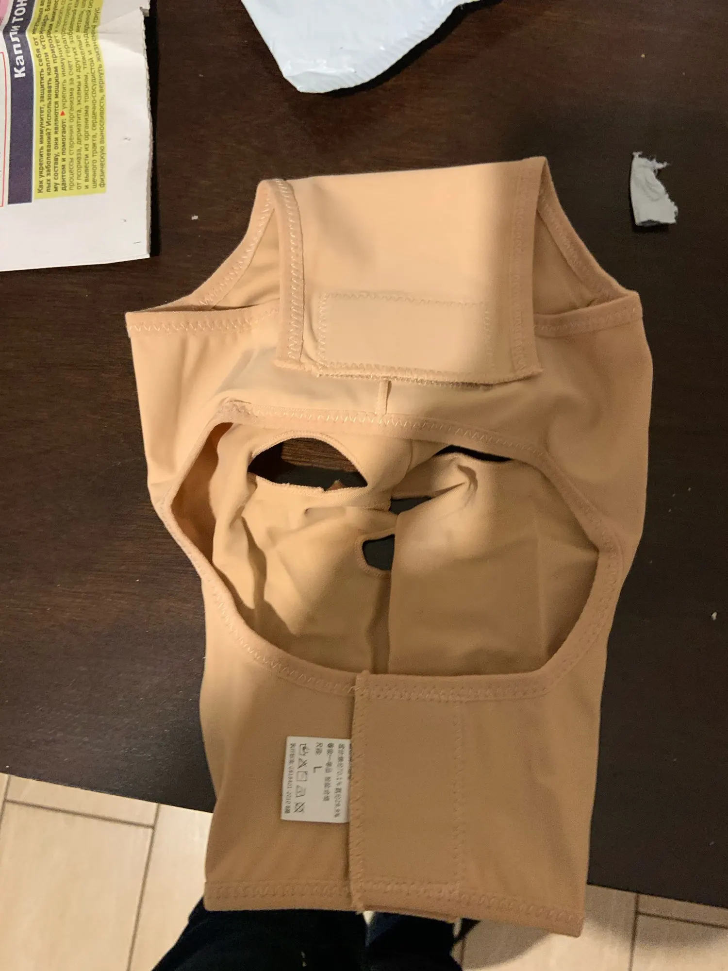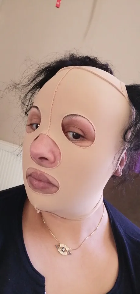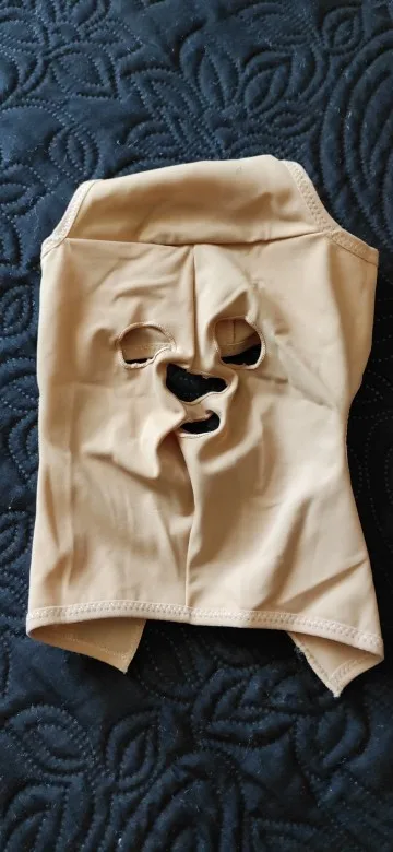 маска сделана из плотной лайкры,как на утягивающем белье.Одевала швами наружу.Размер хл на голову 54 размера подошел,но горловина очень сильно утягивает,даже если липучку закрывать по краю.Но главный минус для меня это маленький вырез под нос,окантовка сильно давит на переносицу,даже если подкладывать что—то мягкое под маску.Одевала два раза,но долго не смогла в ней быть,сильно болит переносица.Больше одевать не буду,подарю кому—нибудь у кого лицо по—меньше.Куплю другую маску,только для подбородка.