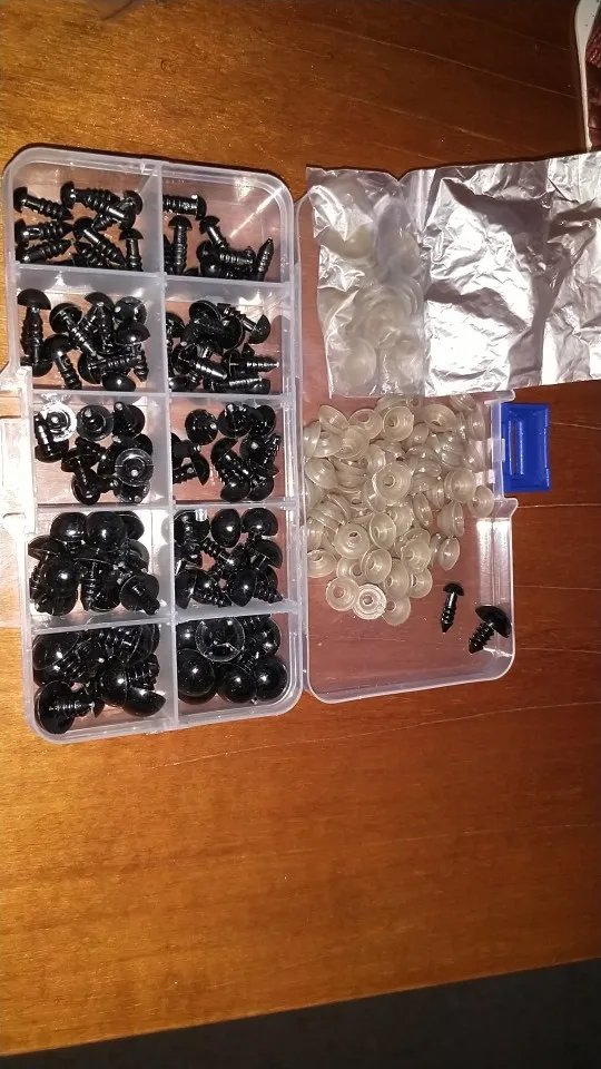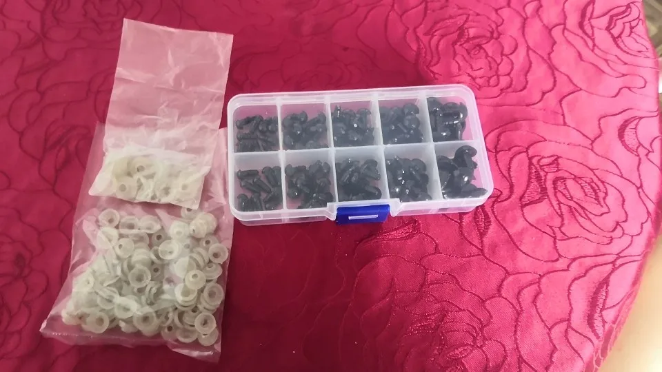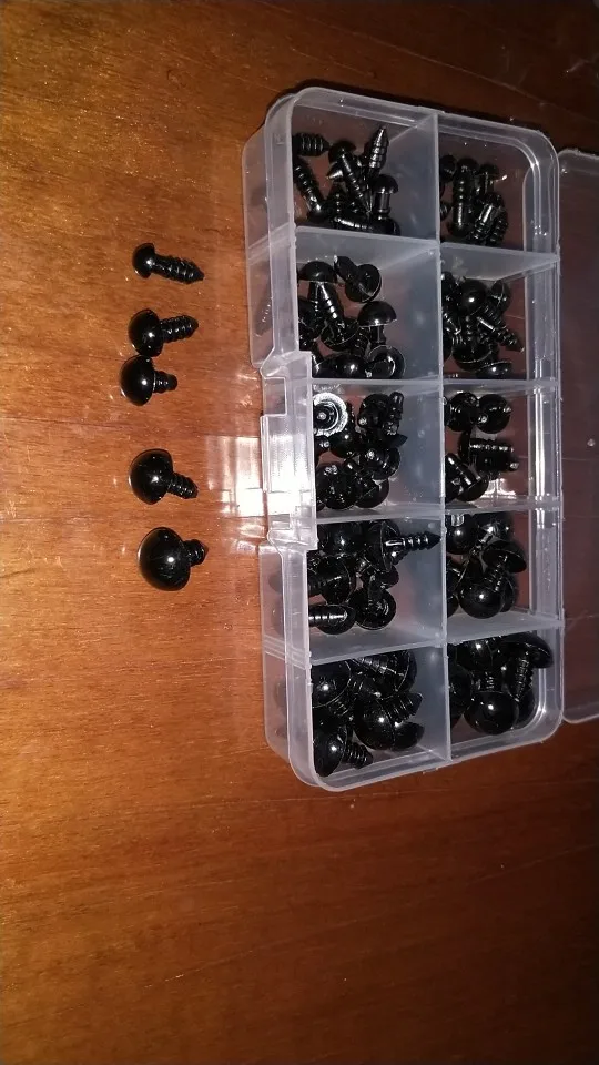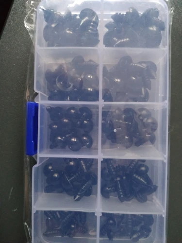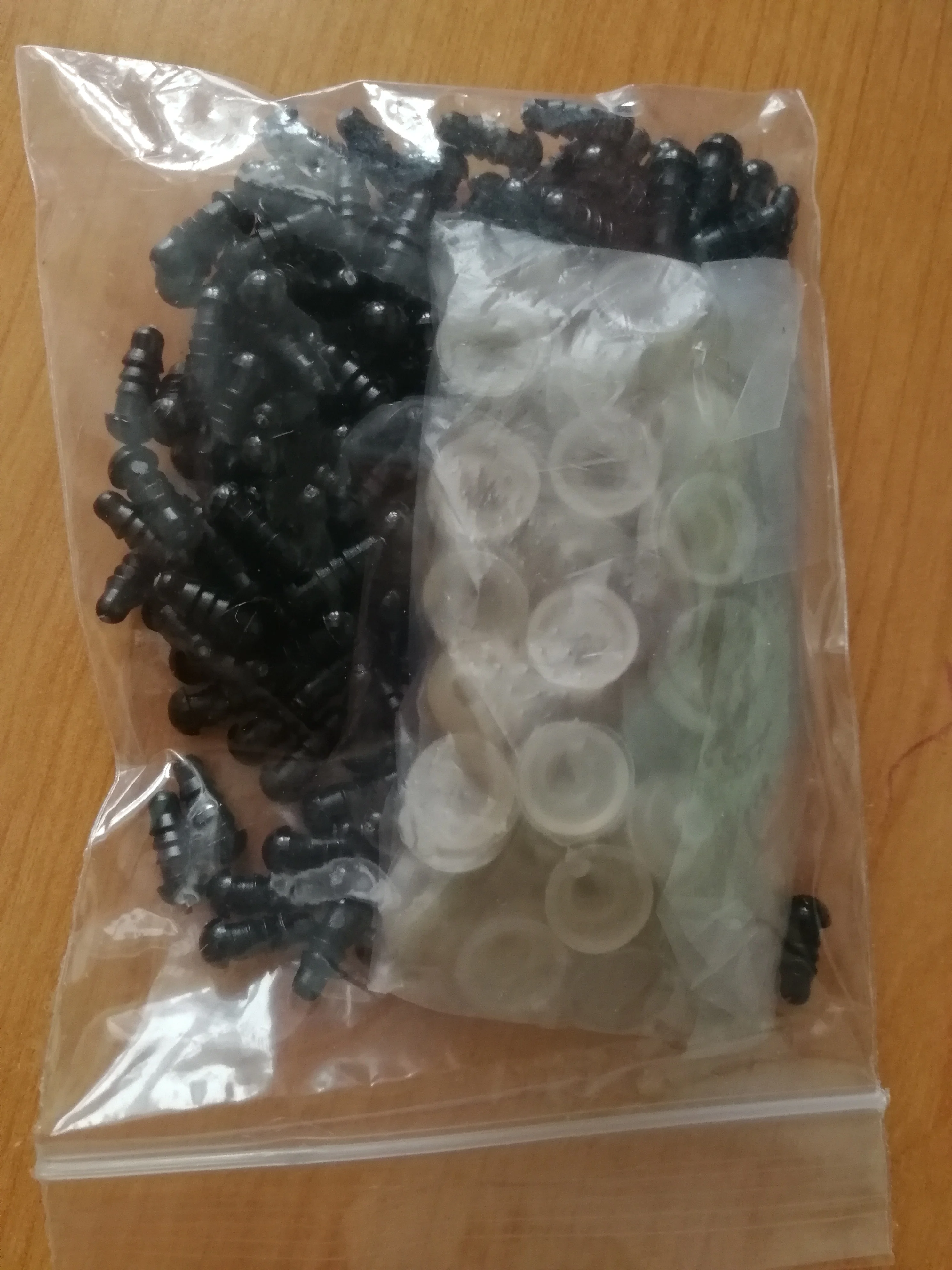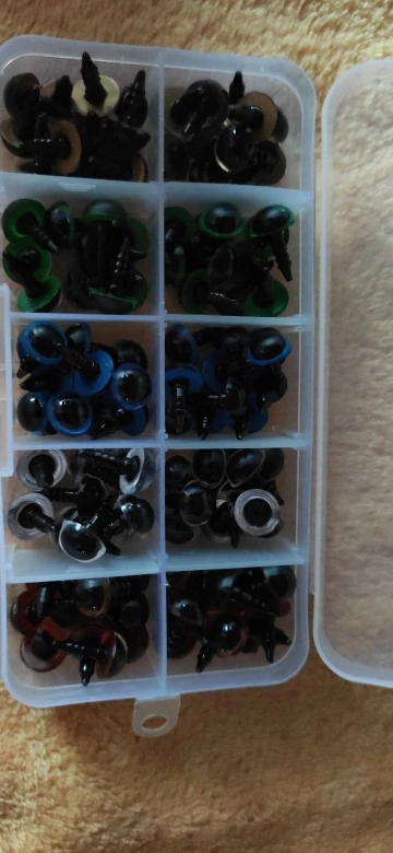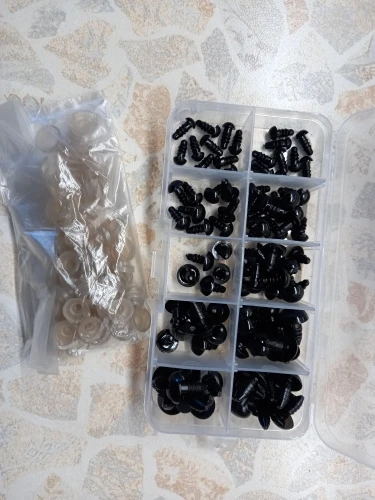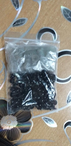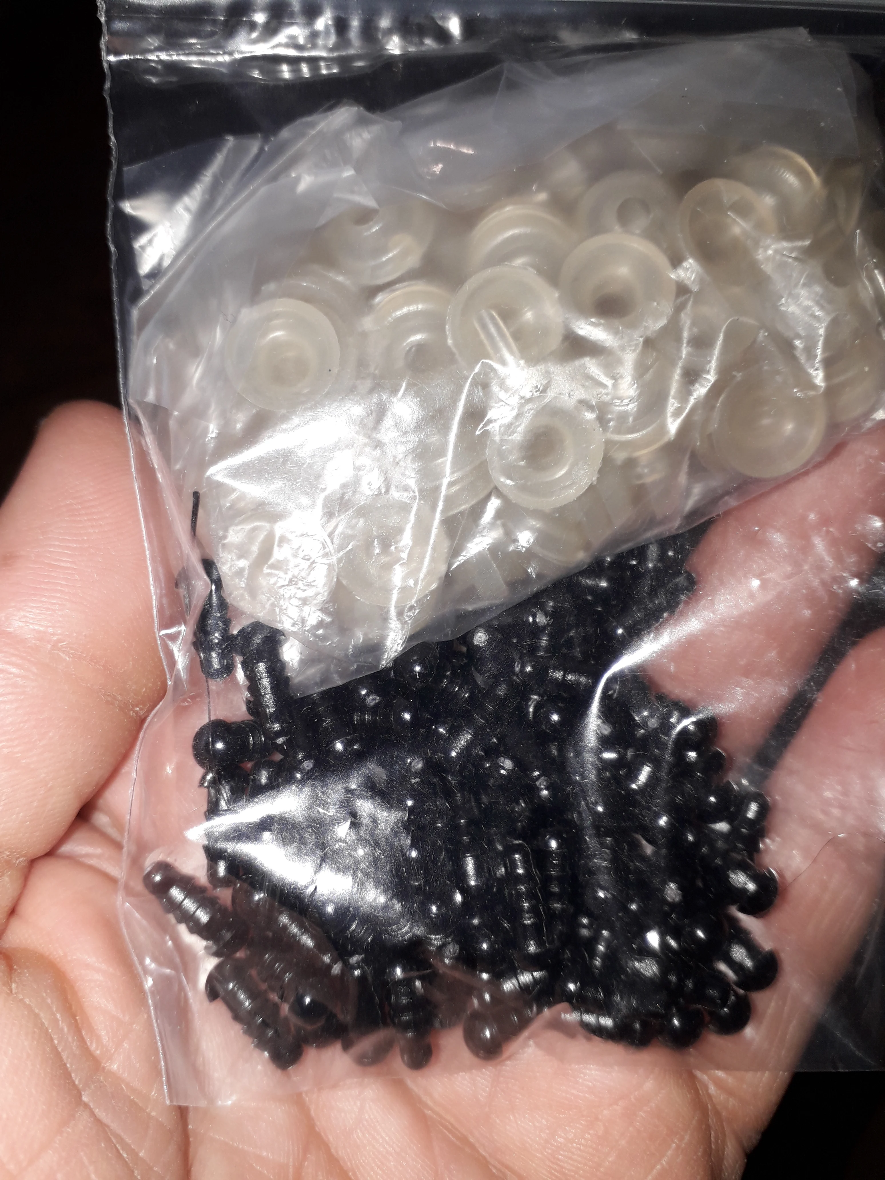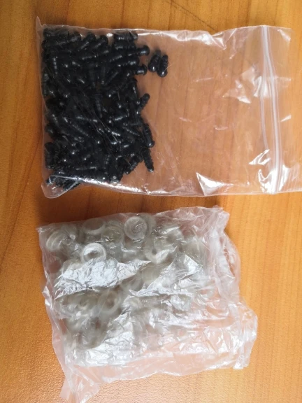 Доставка стандартная, около месяца. В наборе ровно 100 глазок. Из сотни 11 с кривыми ножками, штук 6 кривоватые по окружности. Креплений 82 маленькие и 19 более крупных для глазок 10-12 мм. Но одно мелкое крепление оказалось бракованым. Получается, что креплений тоже ровно сотня. Плохо только, что 81/19 а не 80/20. Теперь если придётся крепить последнюю пару глаз 12 мм то нужно думать, где взять заглушку по размеру. А так вполне сносно для такой стоимости.