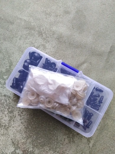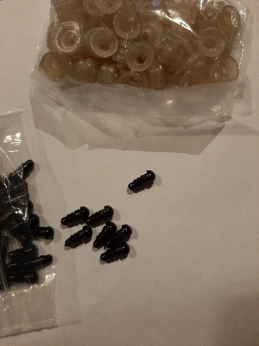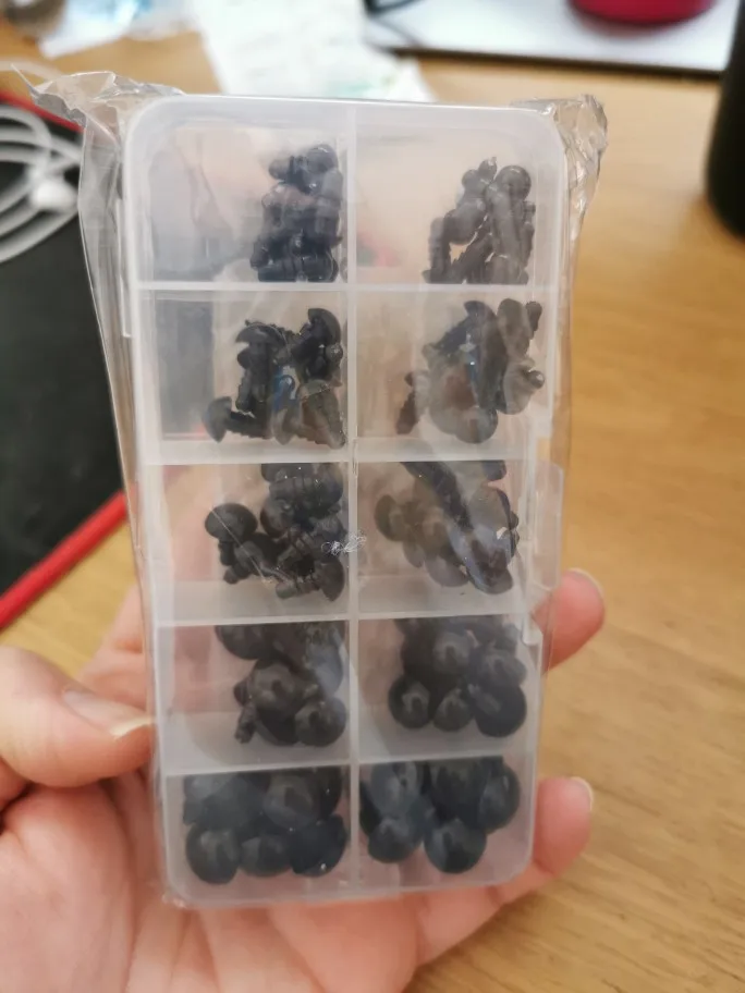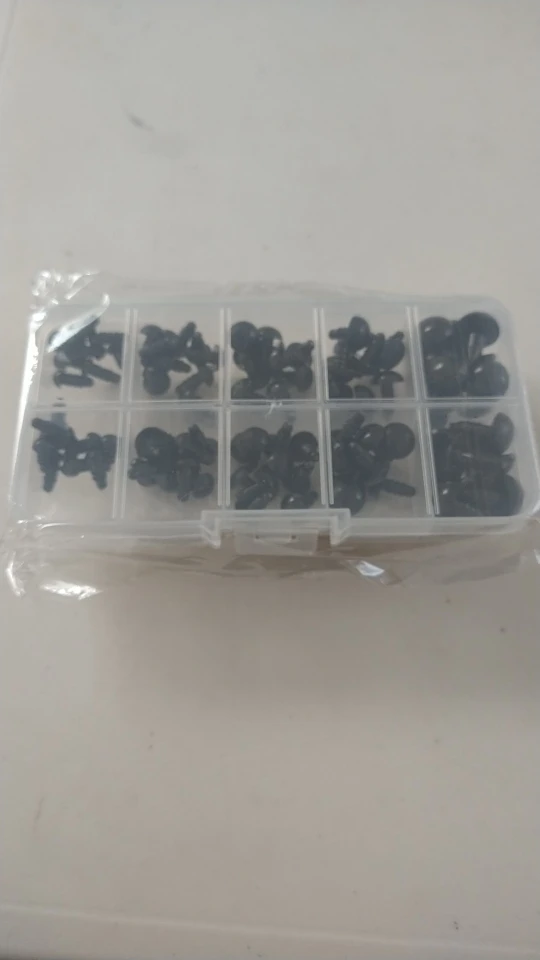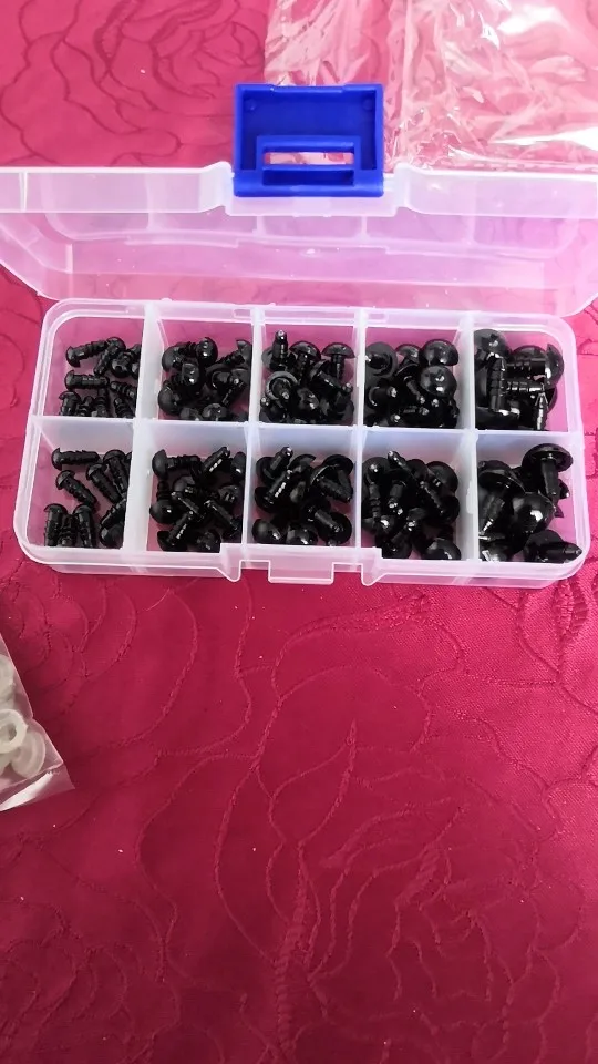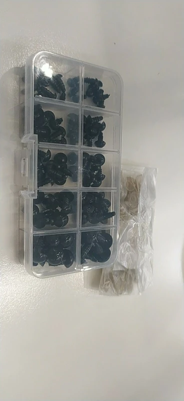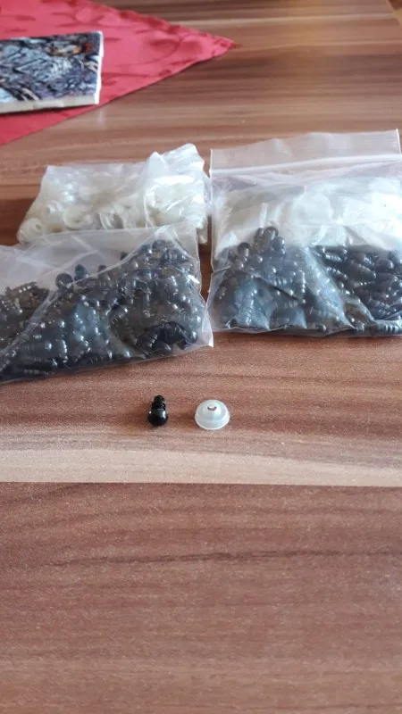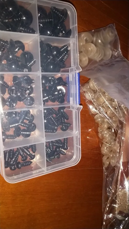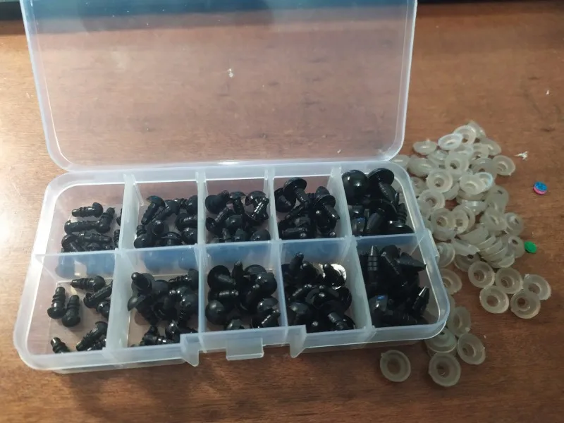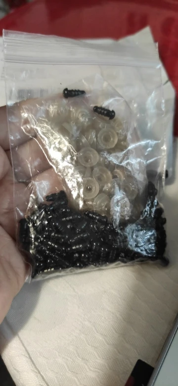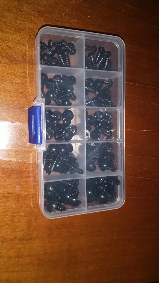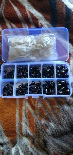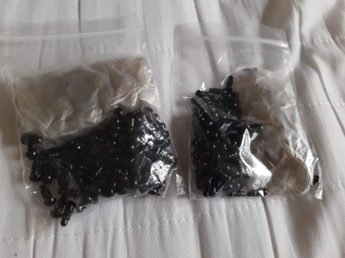 Доставка стандартная, около месяца. В наборе ровно 100 глазок. Из сотни 11 с кривыми ножками, штук 6 кривоватые по окружности. Креплений 82 маленькие и 19 более крупных для глазок 10-12 мм. Но одно мелкое крепление оказалось бракованым. Получается, что креплений тоже ровно сотня. Плохо только, что 81/19 а не 80/20. Теперь если придётся крепить последнюю пару глаз 12 мм то нужно думать, где взять заглушку по размеру. А так вполне сносно для такой стоимости.