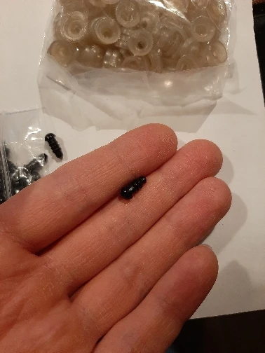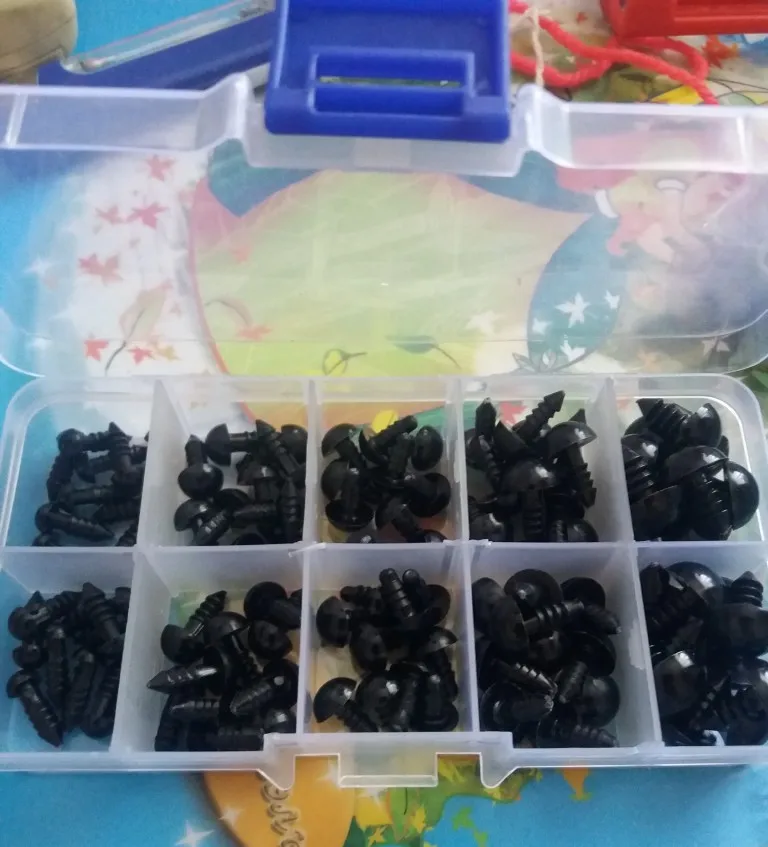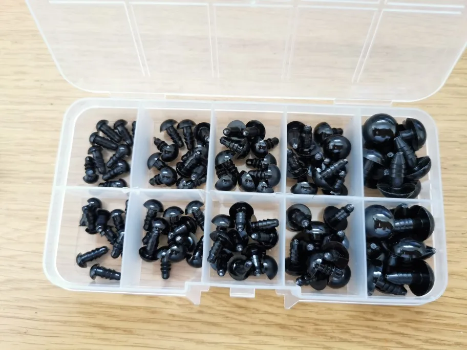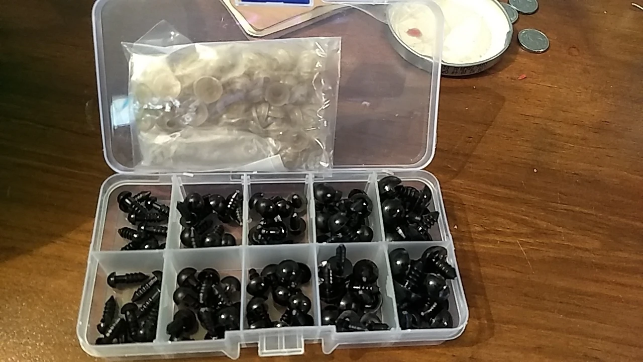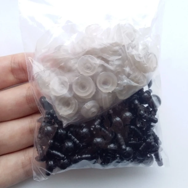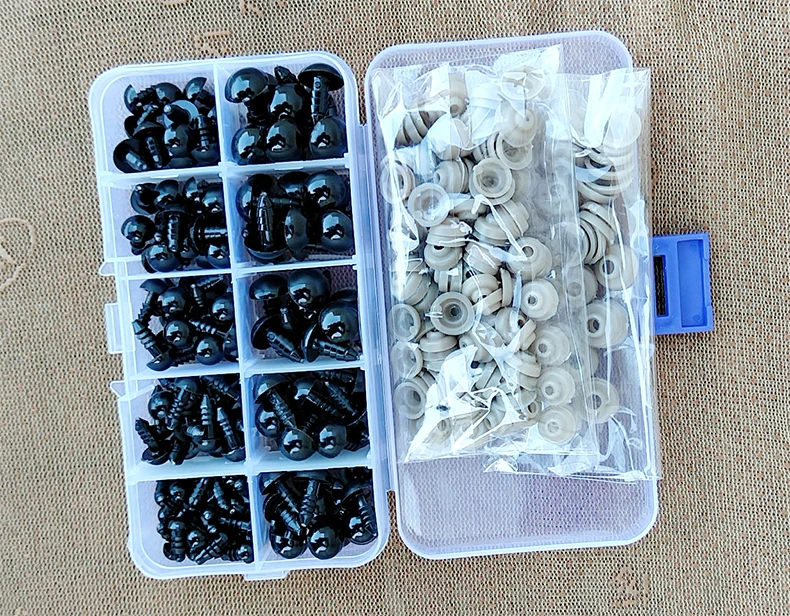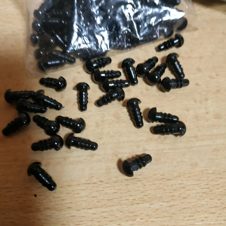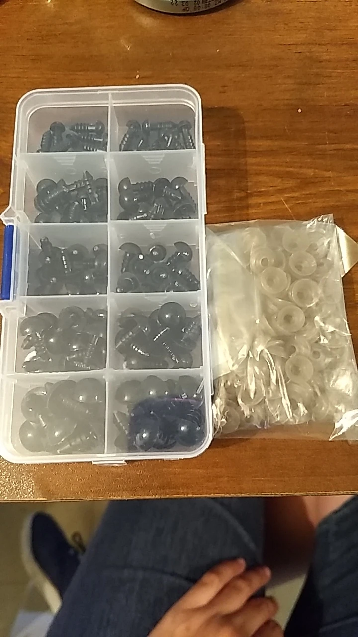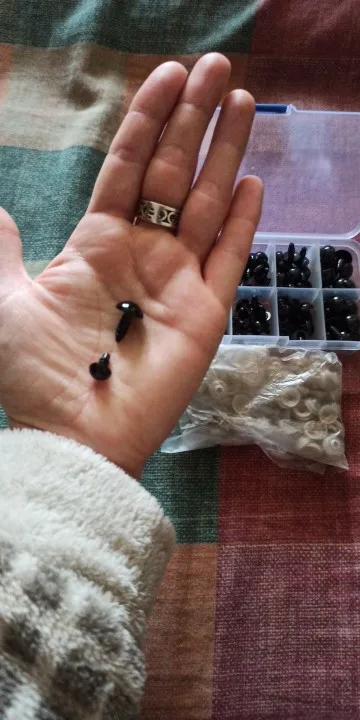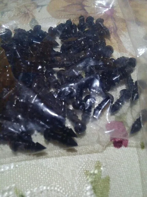 Доставка стандартная, около месяца. В наборе ровно 100 глазок. Из сотни 11 с кривыми ножками, штук 6 кривоватые по окружности. Креплений 82 маленькие и 19 более крупных для глазок 10-12 мм. Но одно мелкое крепление оказалось бракованым. Получается, что креплений тоже ровно сотня. Плохо только, что 81/19 а не 80/20. Теперь если придётся крепить последнюю пару глаз 12 мм то нужно думать, где взять заглушку по размеру. А так вполне сносно для такой стоимости.