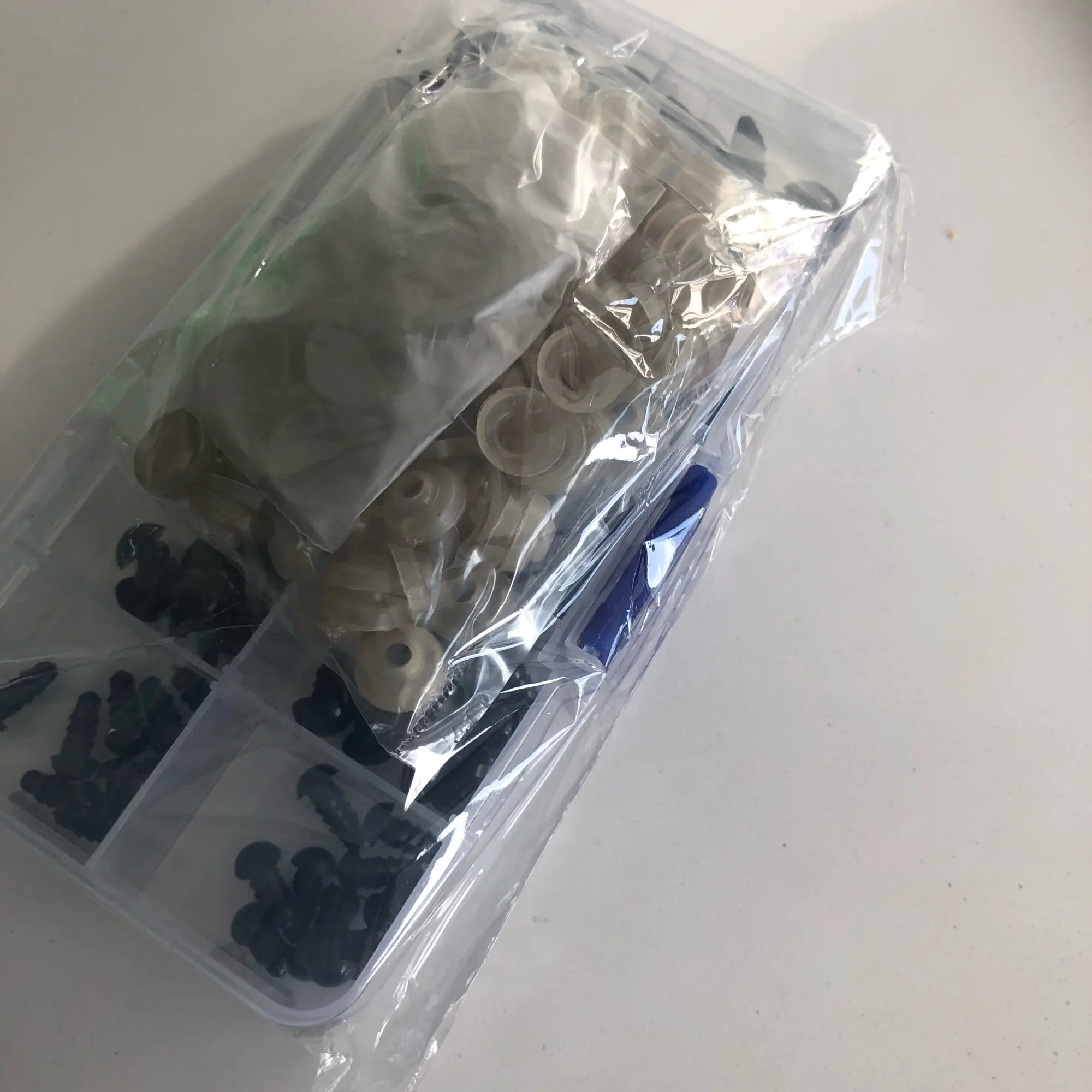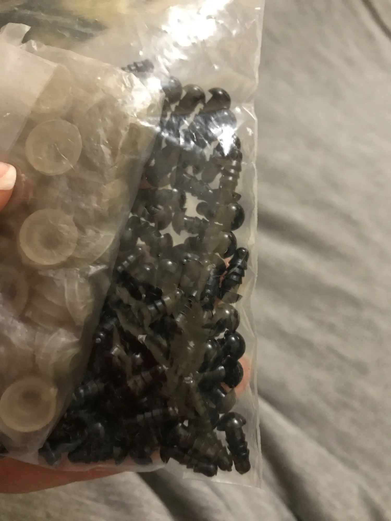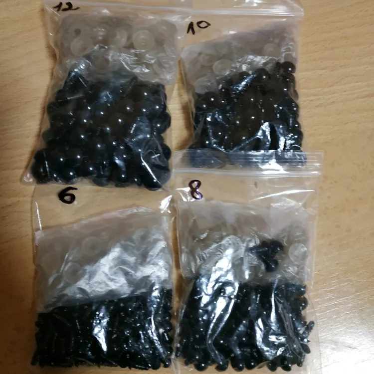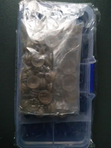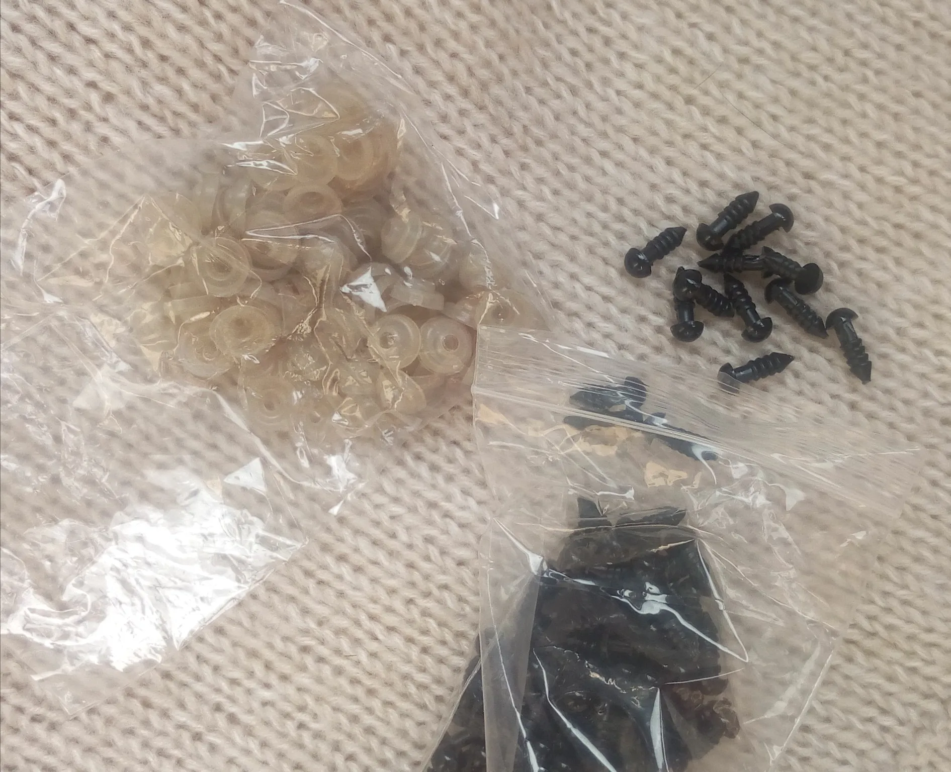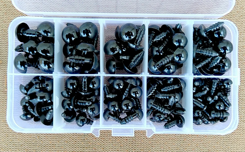 Доставка стандартная, около месяца. В наборе ровно 100 глазок. Из сотни 11 с кривыми ножками, штук 6 кривоватые по окружности. Креплений 82 маленькие и 19 более крупных для глазок 10-12 мм. Но одно мелкое крепление оказалось бракованым. Получается, что креплений тоже ровно сотня. Плохо только, что 81/19 а не 80/20. Теперь если придётся крепить последнюю пару глаз 12 мм то нужно думать, где взять заглушку по размеру. А так вполне сносно для такой стоимости.