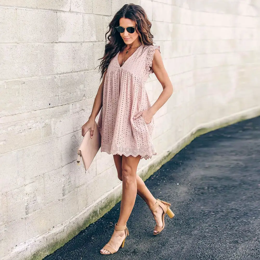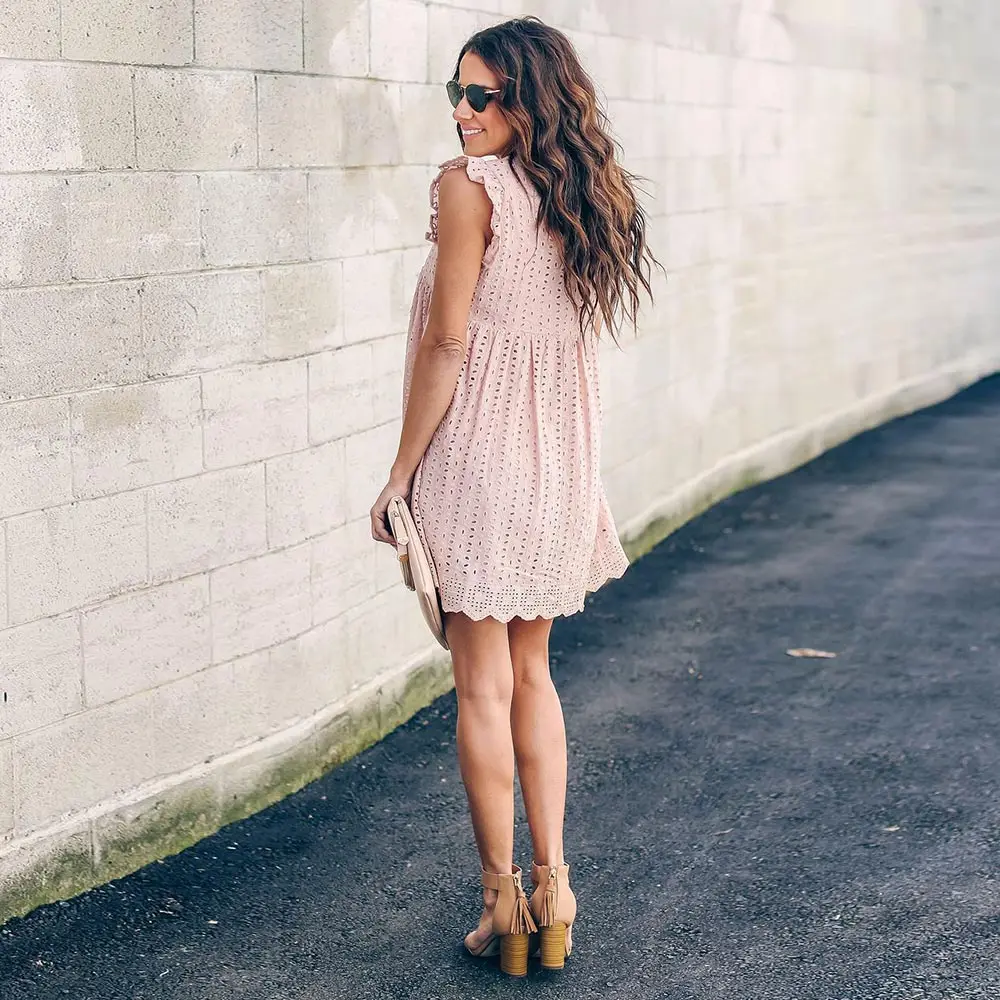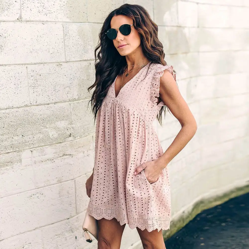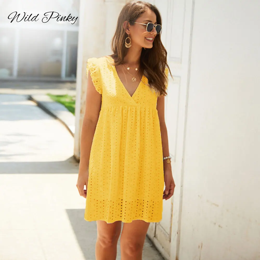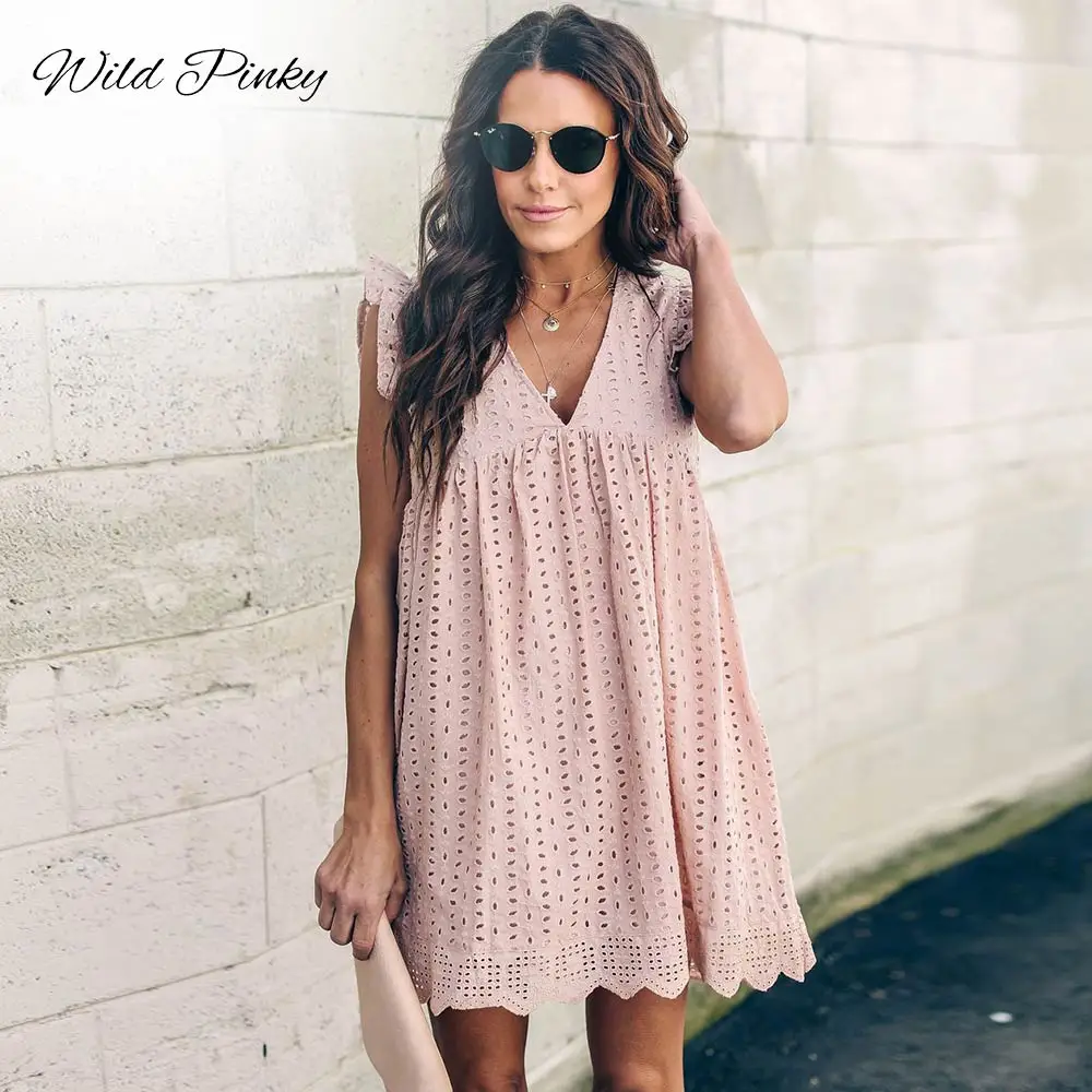 WildPinky, летнее женское кружевное платье с вышивкой, сексуальное платье с оборками на рукавах, повседневное розовое хлопковое мини-платье, платья