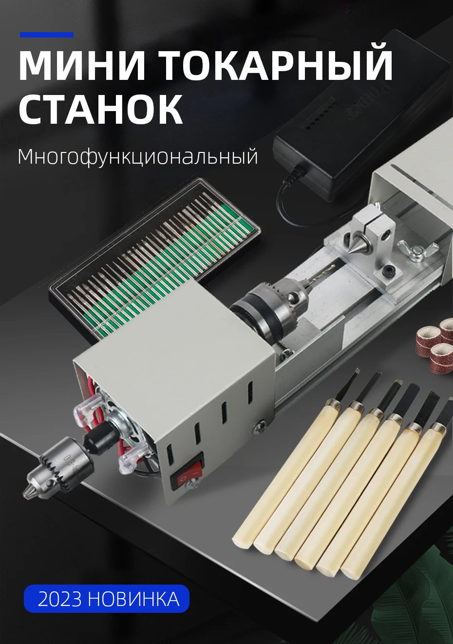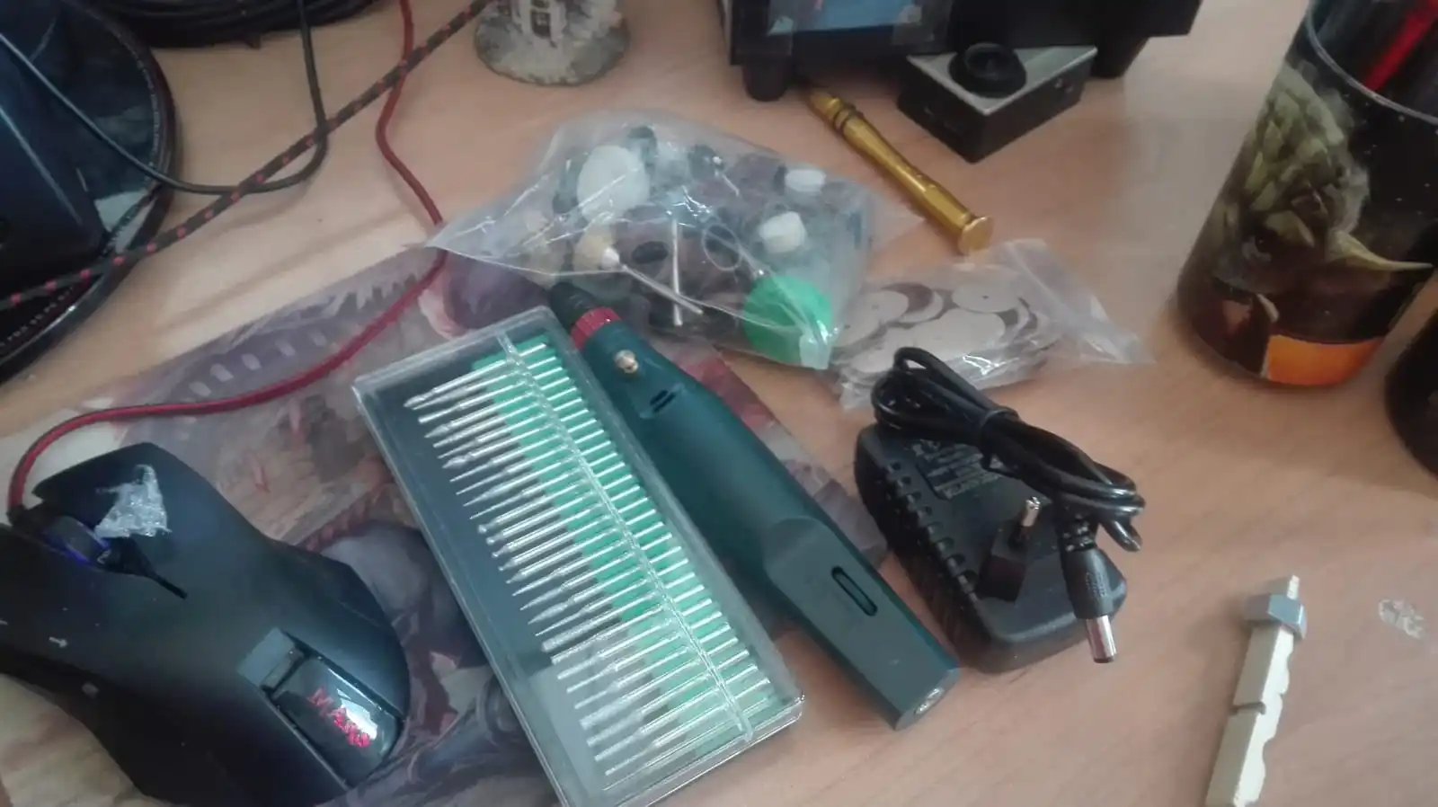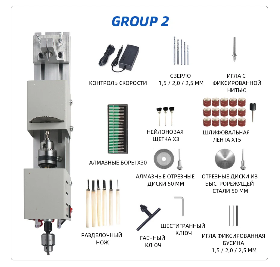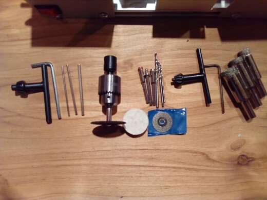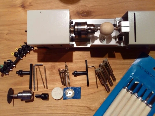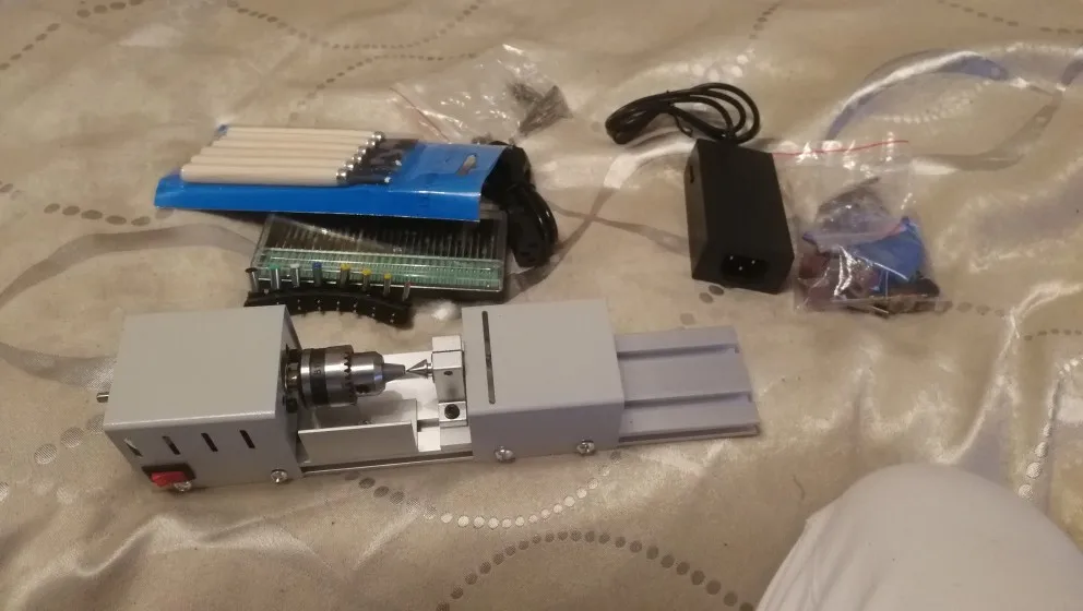 Неплохой станок для хобби и рукоделий. В комплекте идут два патрона как в описании - в моем случае биения нет. Все сухое, без смазки, поэтому все нужно промаслить перед стартом. Блок питания - отдельное спасибо, это по сути универсальный блок питания для ноутов, весьма полезная штука. Насадок на нее тоже много, а вот насадок на отрезание почти нет - только циркулярка, алмазка и один по металлу. Думаю хорошая вещь для работы на балконе или в тесной мастерской