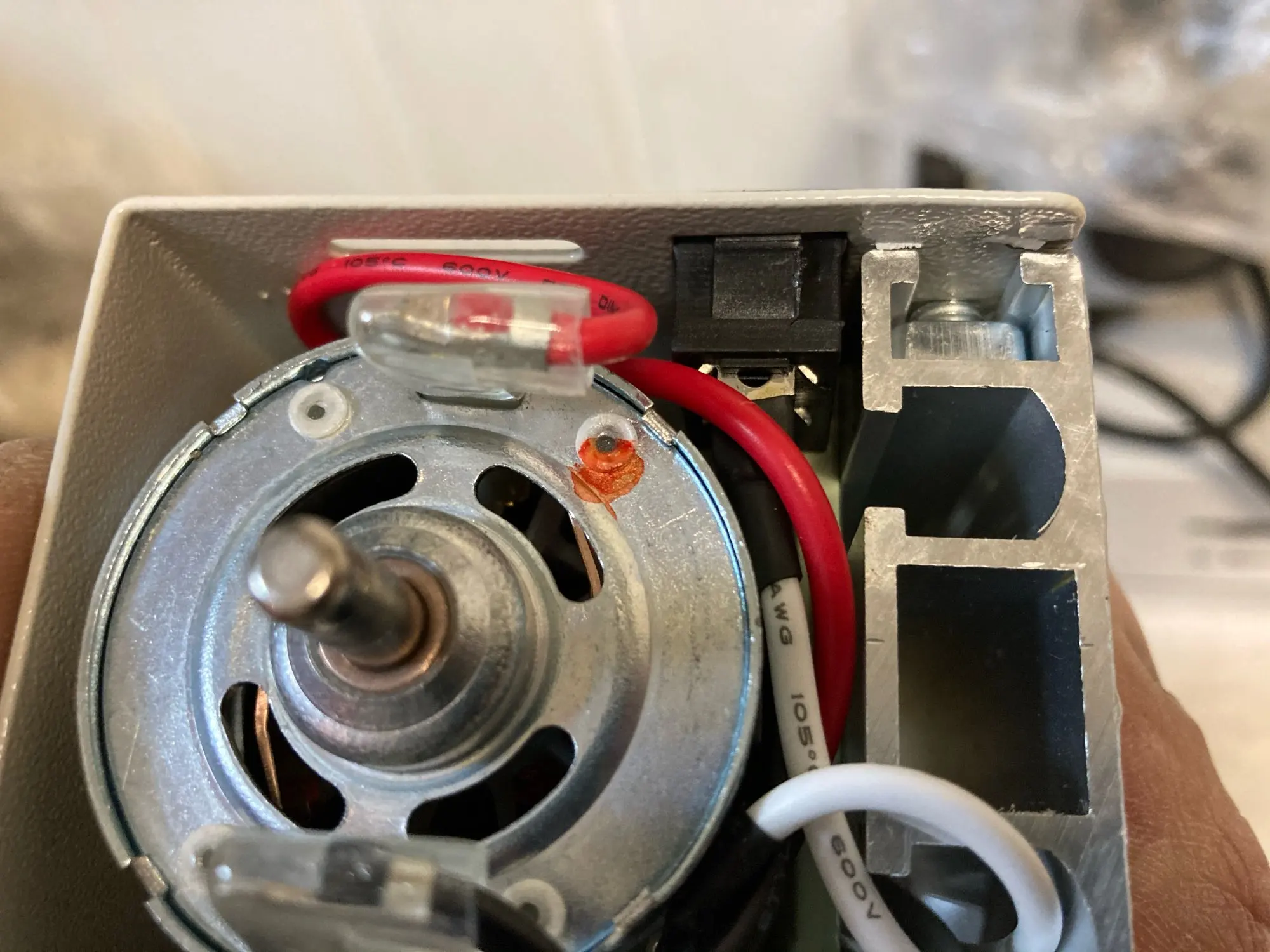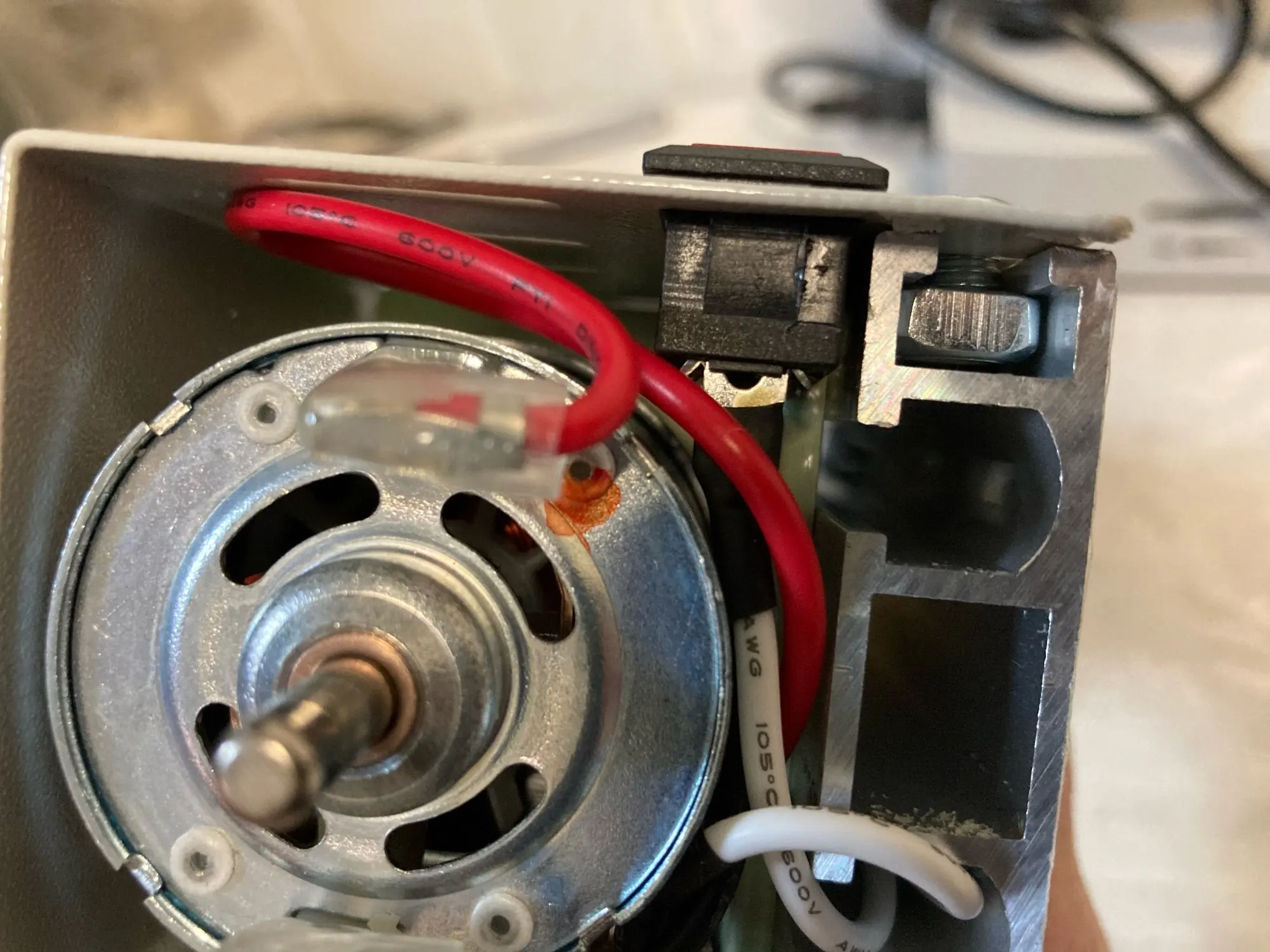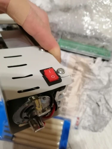 Качество сборки не очень. Тумблер не входит в корпус, мешает станина и двигатель , да и не работает- просто заклинивший. На фото видно. Корпус с насадками разбит, т.к. упаковка неплотная а сама станина тяжелая его раздавила.