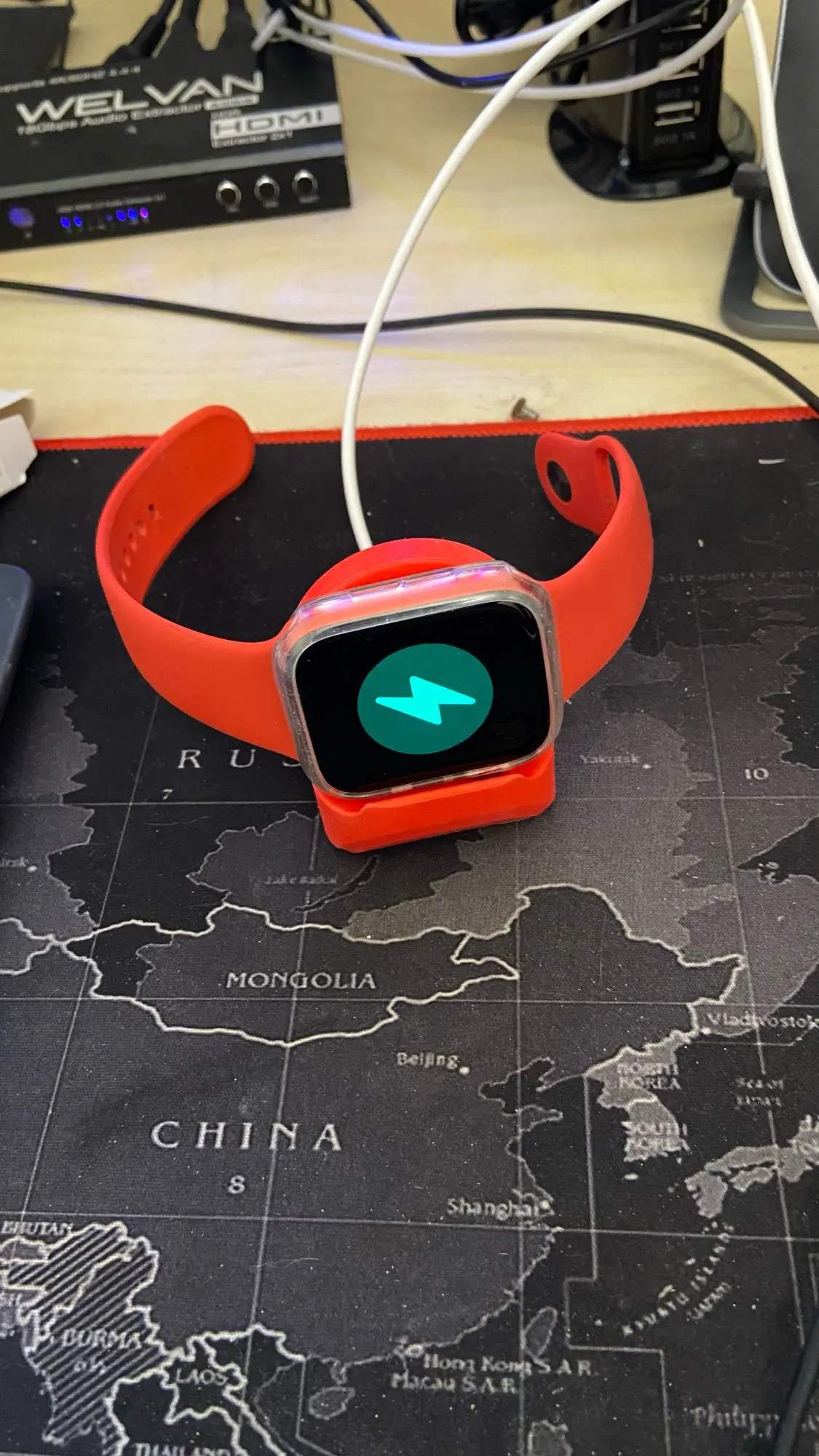 Док-станция эстетичная. Убирает лишний провод на столе. Часы прилипают плотно к зарядке, им ничего не мешает. Часы 44 мм. Провод перегибается не очень сильно, ничего порваться не должно. Доставили до Магадана за 30 дней. Товар хороший.