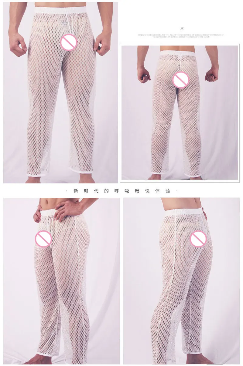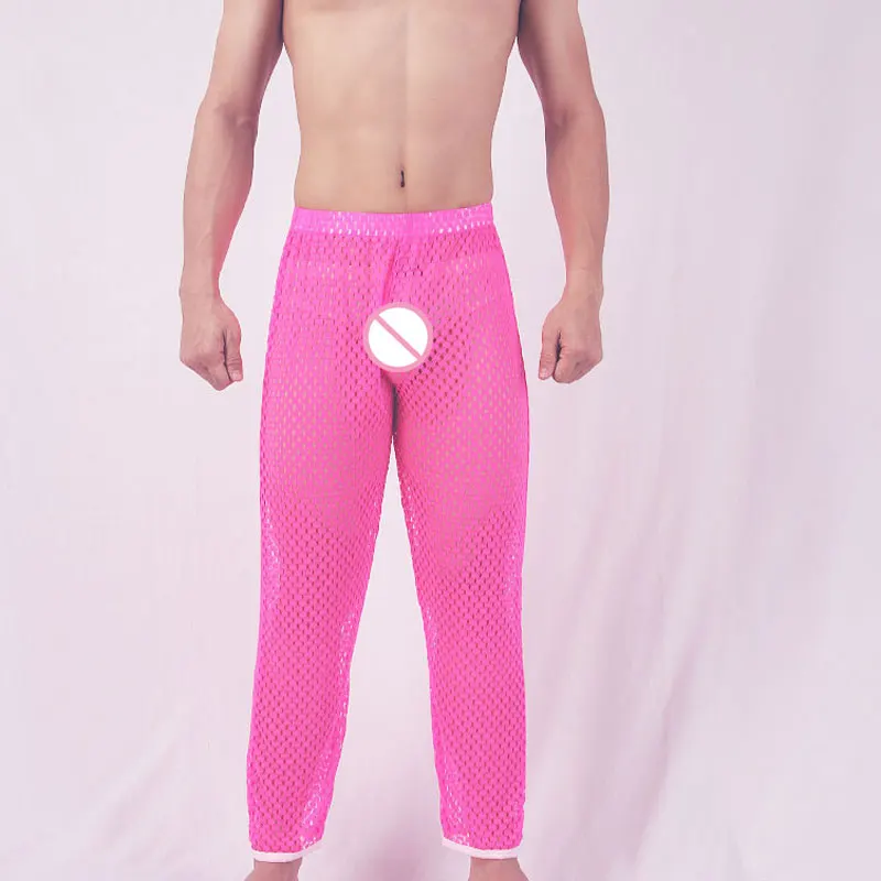 Сексуальные мужские сетчатые прозрачные брюки для отдыха, сексуальные длинные брюки, повседневные брюки с вырезами, мягкая женская одежда, брюки для дома, модель F27