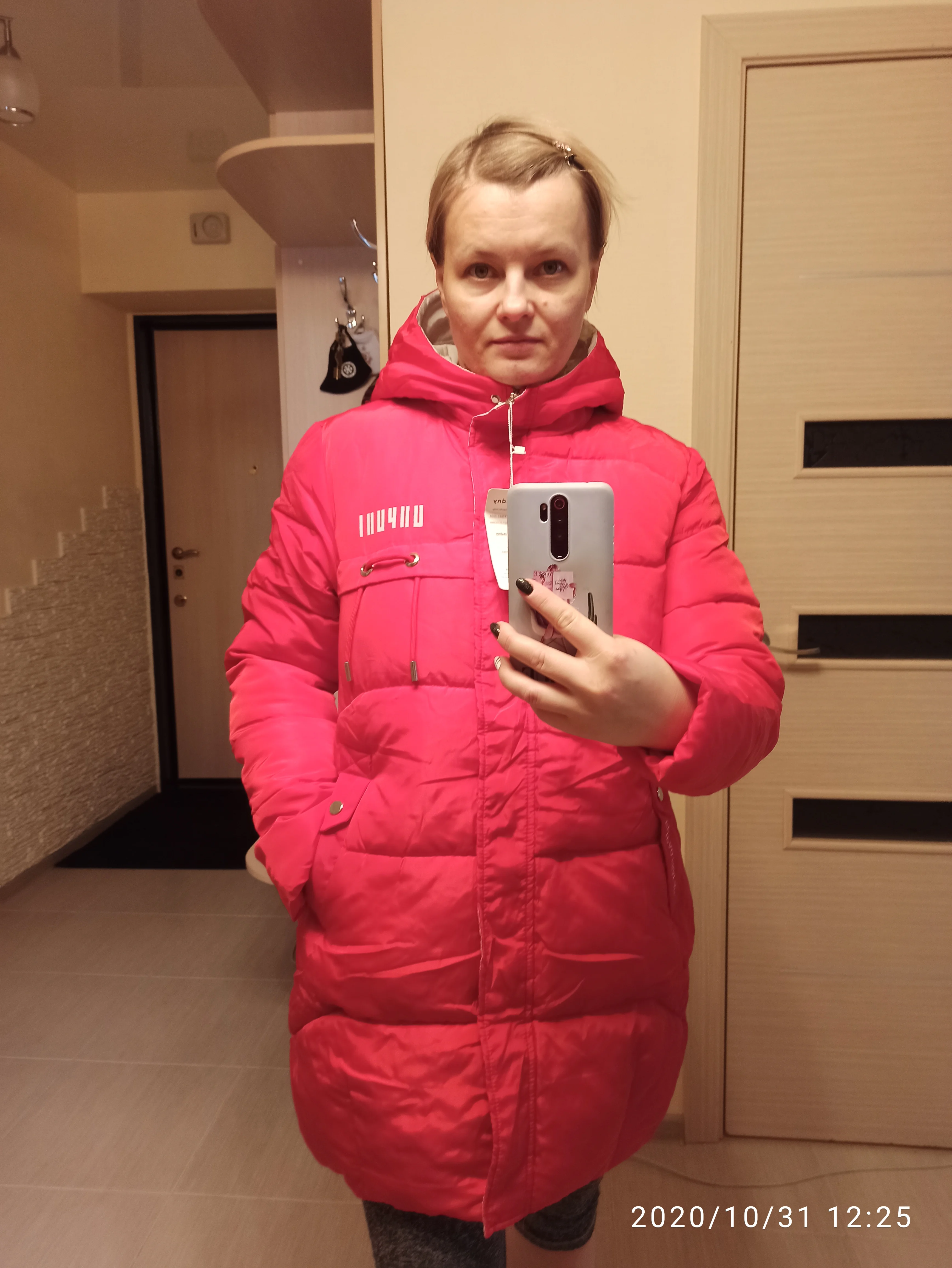 Товар возвращается, потому что, к сожалению, слишком маленький, возьмите на размер больше вашего. В противном случае куртка выглядела сверху.