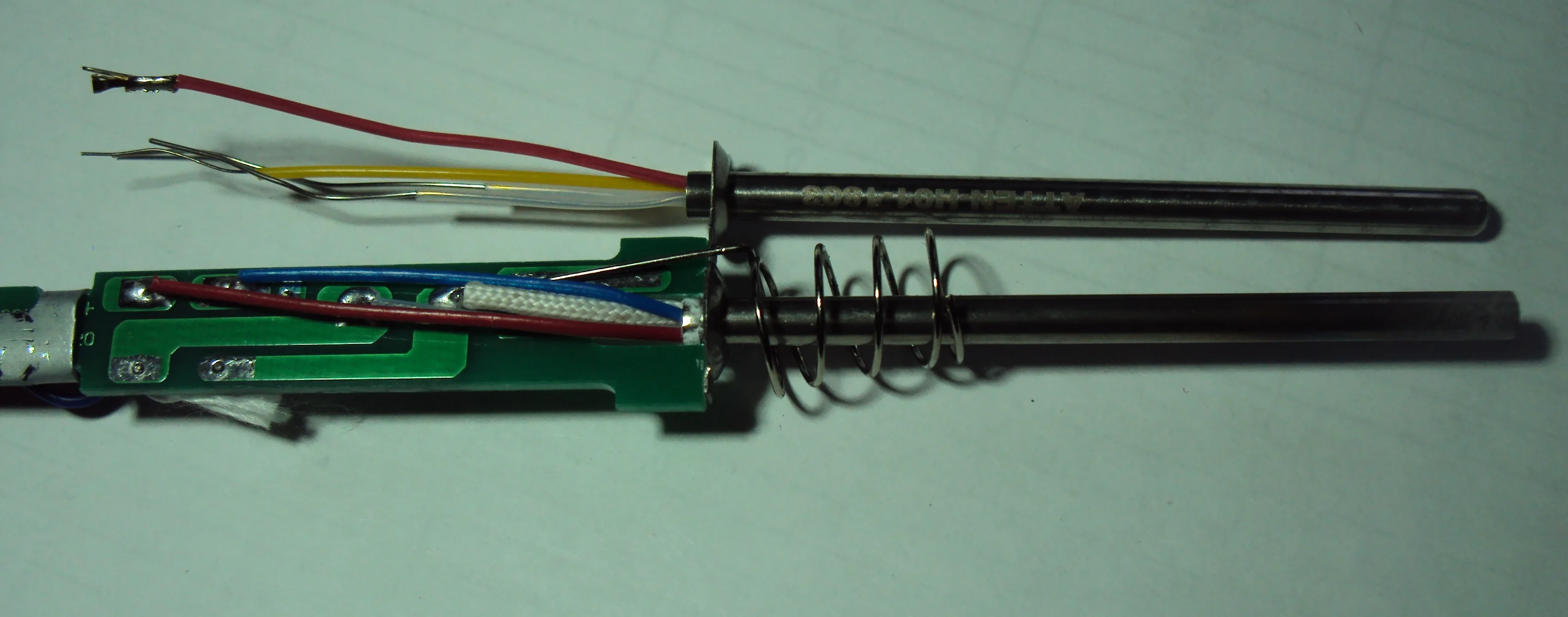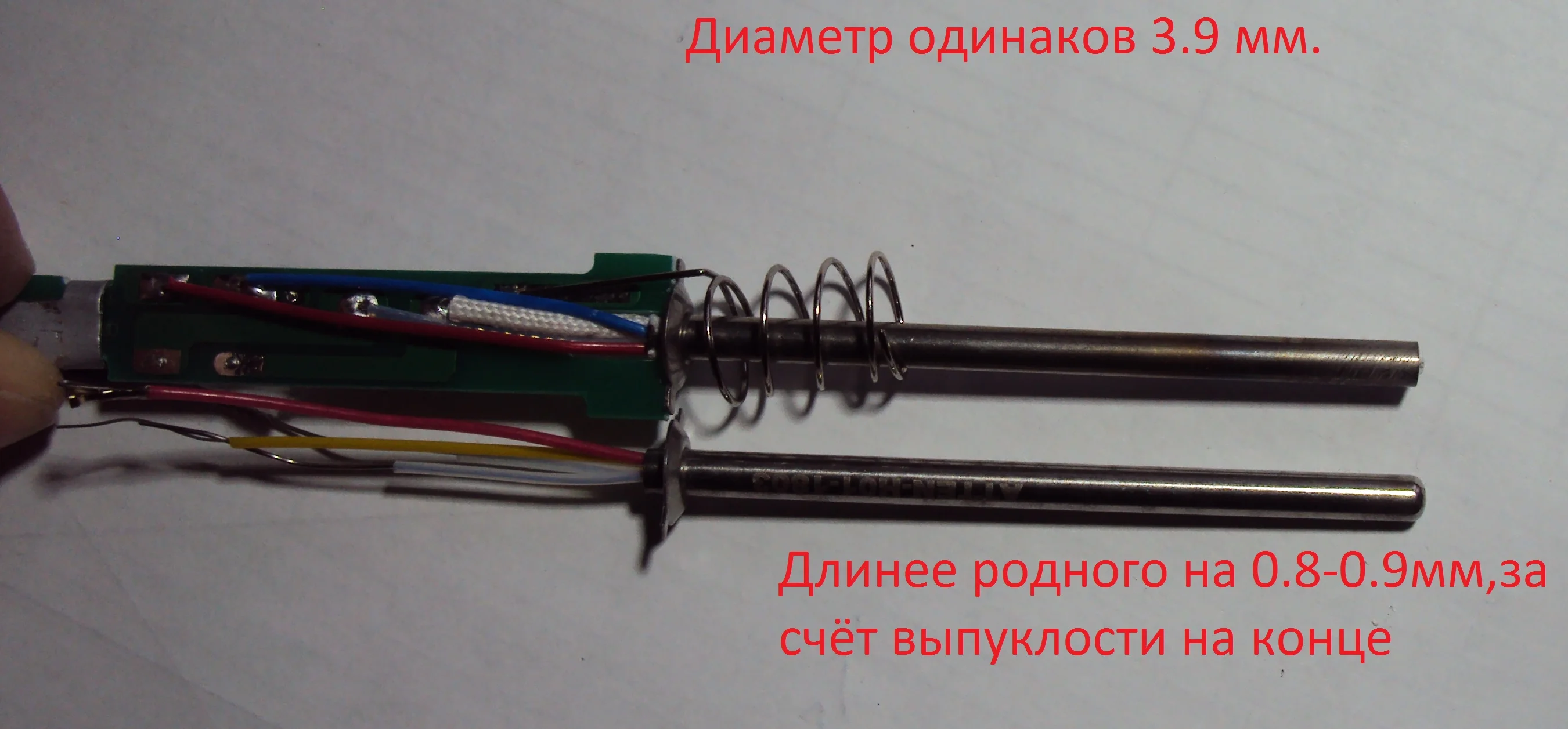 Нагреватель нормальный ,сопротивление 12.3 ом.термопара -1.2 ом.,длина 63.5 мм.чуть длинее на(0.8-1мм)чем в моём паяльнике,но это не проблема установить можно,наружный диаметр 3.9 мм,как в родном.Впаяльник не устанавливал,брал на замену,но подключал к блоку питания при 12v ,ток при включении 0.88 А.,Нагрев быстрый,на 24 V не проверял.Нормально.