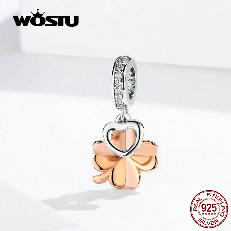WOSTU, розовое золото, четыре листа, сердце, болтается, шарм, Стерлинговое Серебро 925 пробы, циркониевые бусины, подходит для оригинального браслета, кулон, хорошее ювелирное изделие, FIC1238