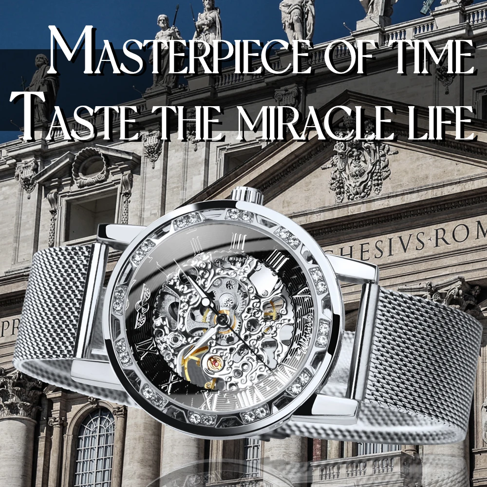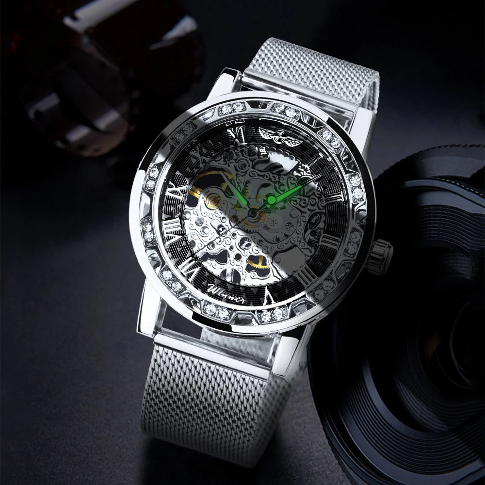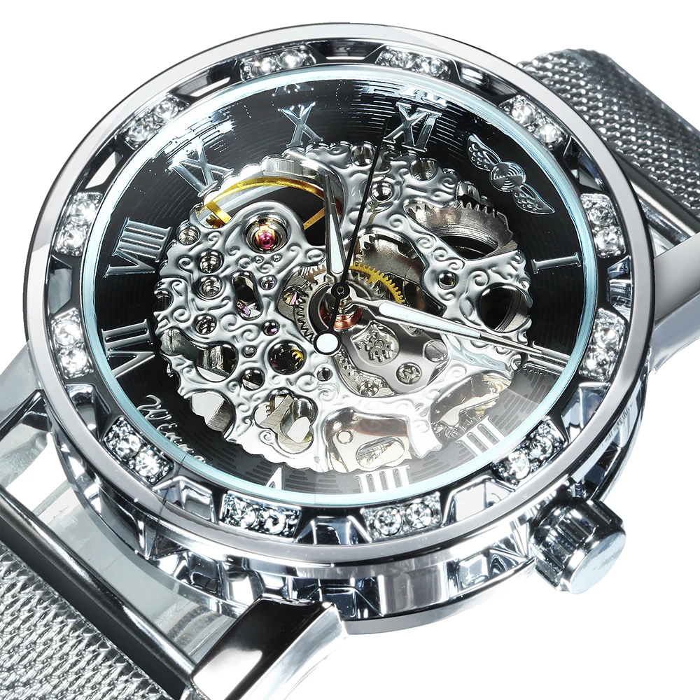 Часы наручные WINNER Мужские механические, модные брендовые роскошные механические ультратонкие часы-скелетоны с резным ремешком и кристаллами, унисекс
