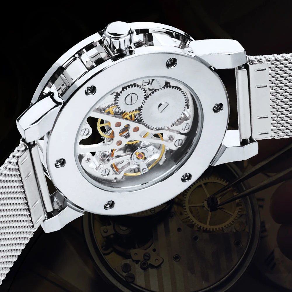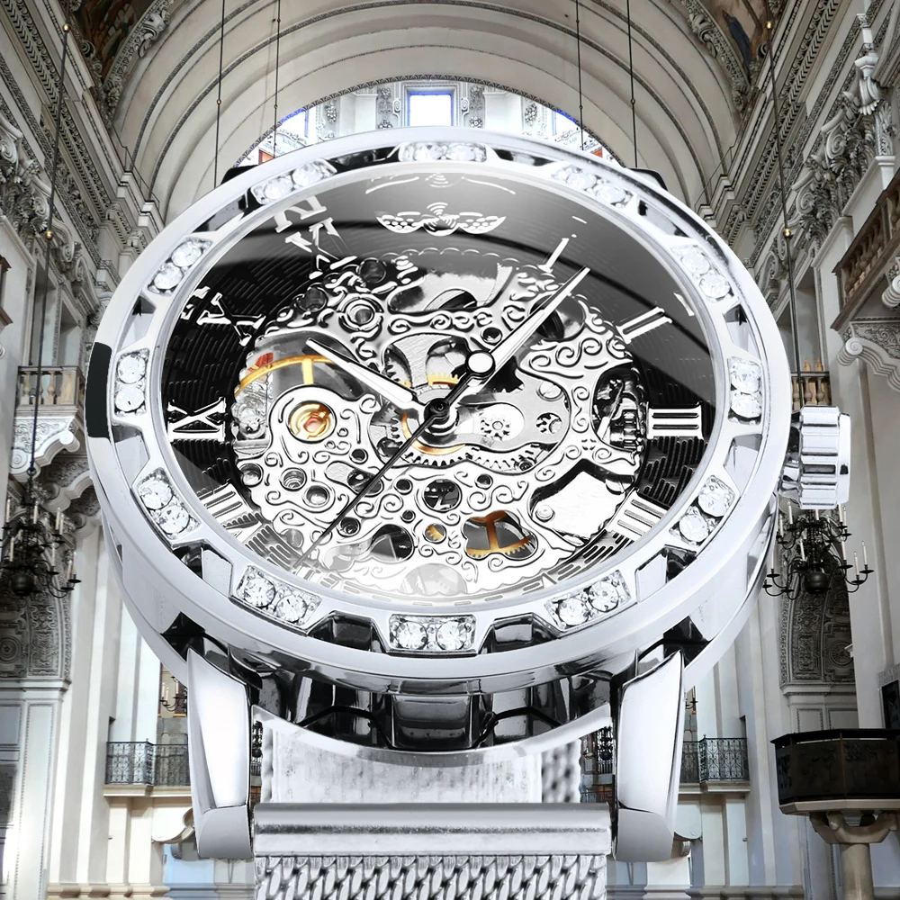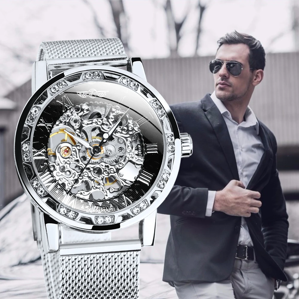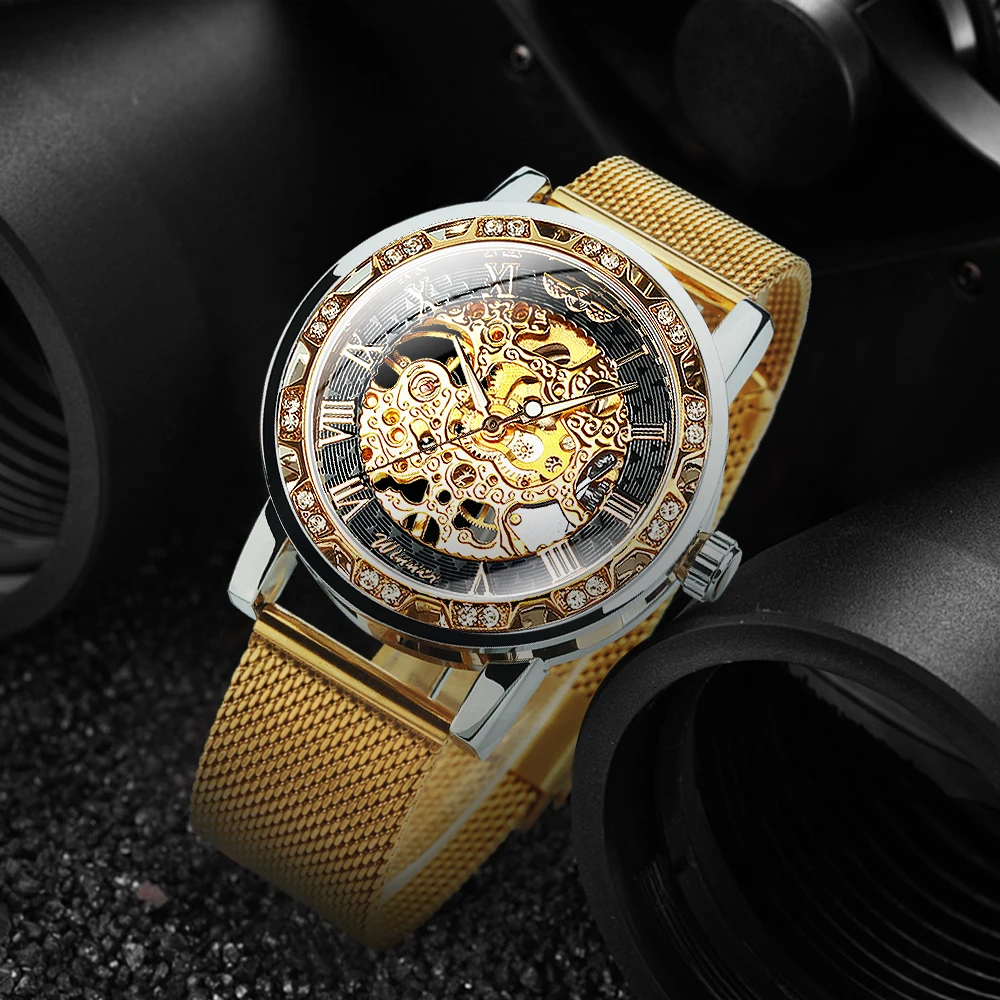 Часы наручные WINNER Мужские механические, модные брендовые роскошные механические ультратонкие часы-скелетоны с резным ремешком и кристаллами, унисекс