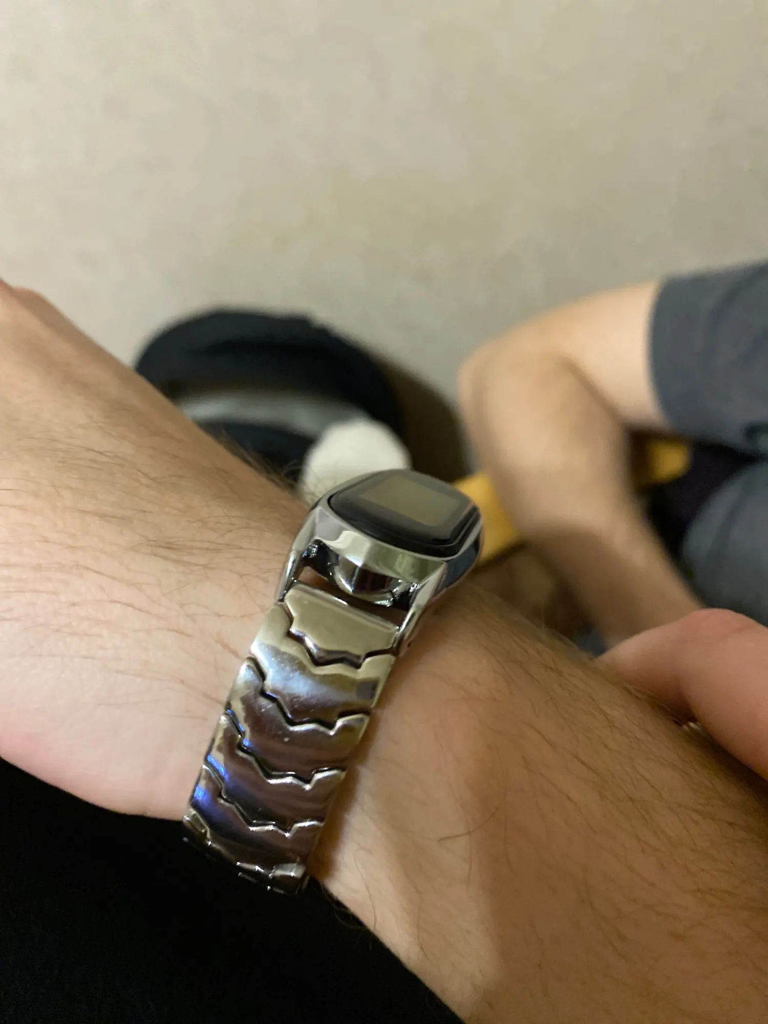Ремешок довольно лёгкий, что для меня скорее минус, выглядит хрупковато, но в целом, видно качество хорошее. Ещё он более глянцевый чтоли, чем на картинке. Большой плюс, что в комплекте переходники на все последние модели, поэтому, можно использовать на ми бенд 3,4, 5. В комплекте также инструмент для удаления лишних звеньев, запас размера ремешка на большую руку хороший.