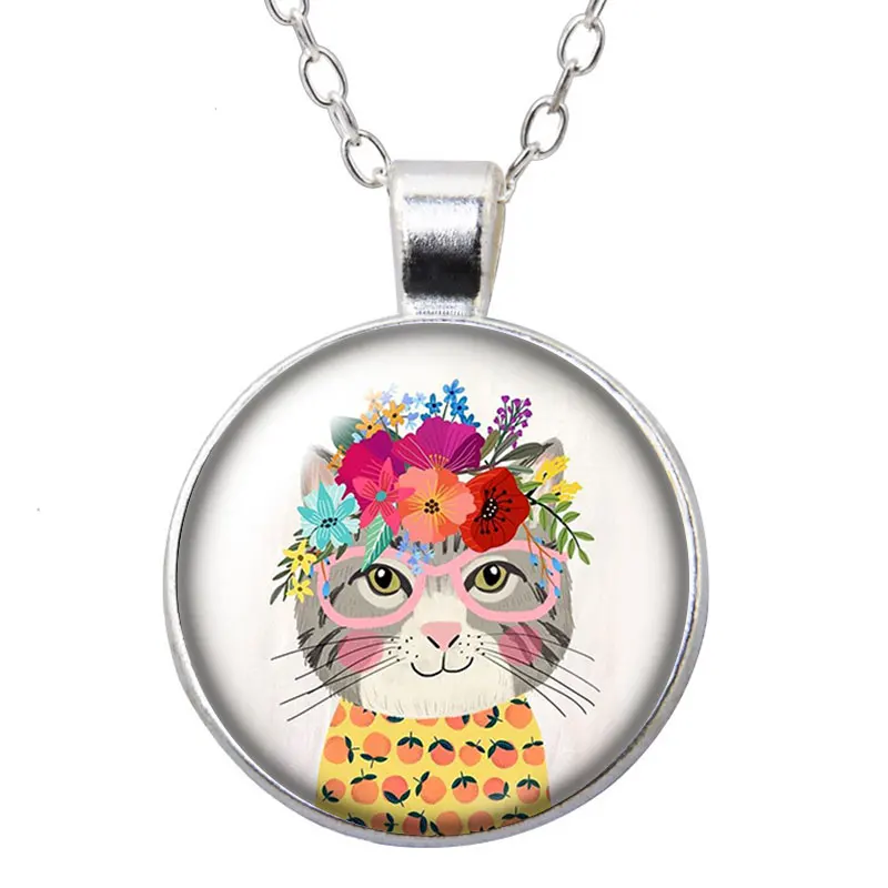 Ожерелье с подвеской в виде кошки, 25 мм, стеклянный кабошон, сереб...