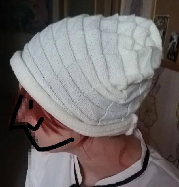 На фотографии шапка объёмная, а на самом деле узкий чулок. На голове смотрится, как маленький колпачек
