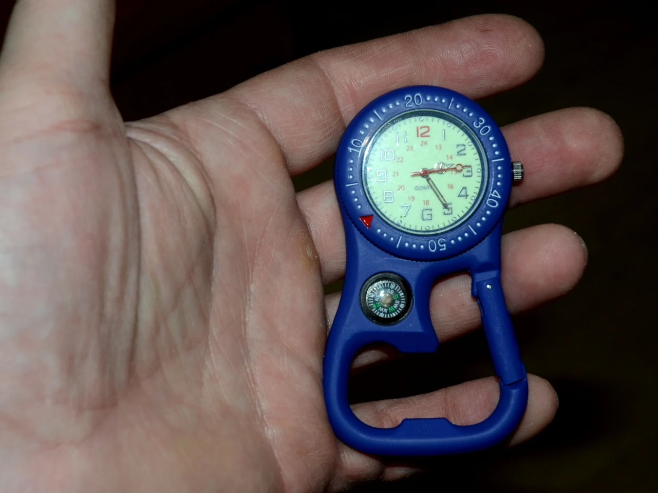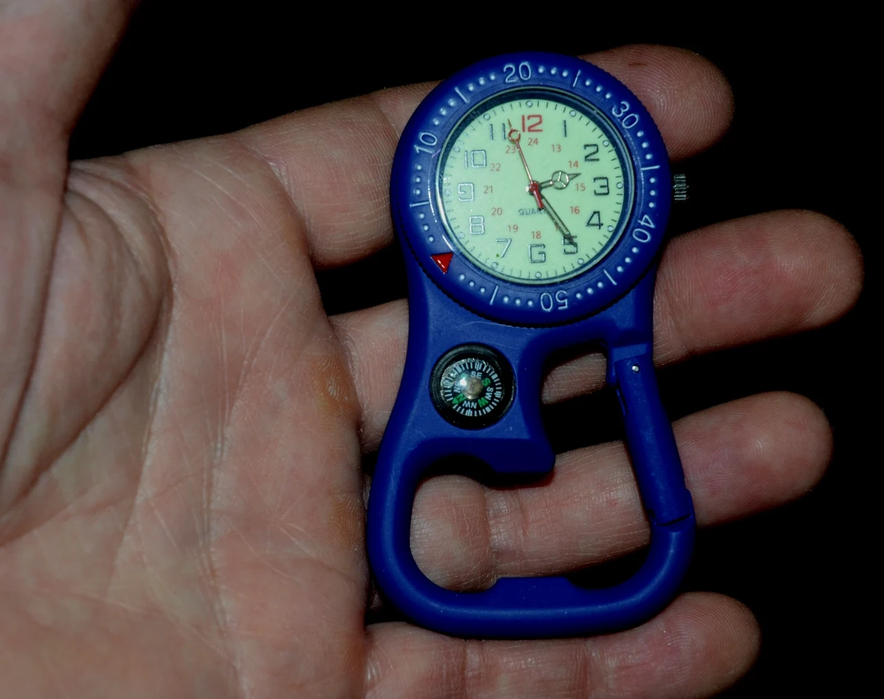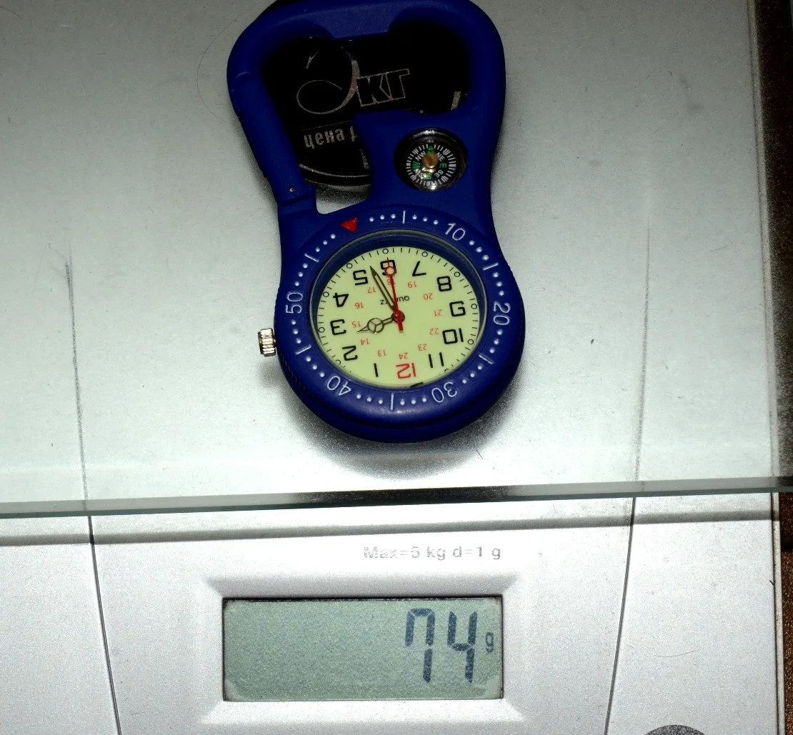 Хорошие часы. Покрытие приятное, бархатистое на ощупь. Вес 74 грамма, довольно увесистые. Карабин открывается и закрывается хорошо. Ночью циферблат светится пару часов (точно не замерял). Компас маленький, трудновато разглядеть. Часы 5 дней идут точно, минута в минуту. На удивление точно показывает компас, не ожидал если честно) Доставка 10 дней. Рекомендую к покупке!