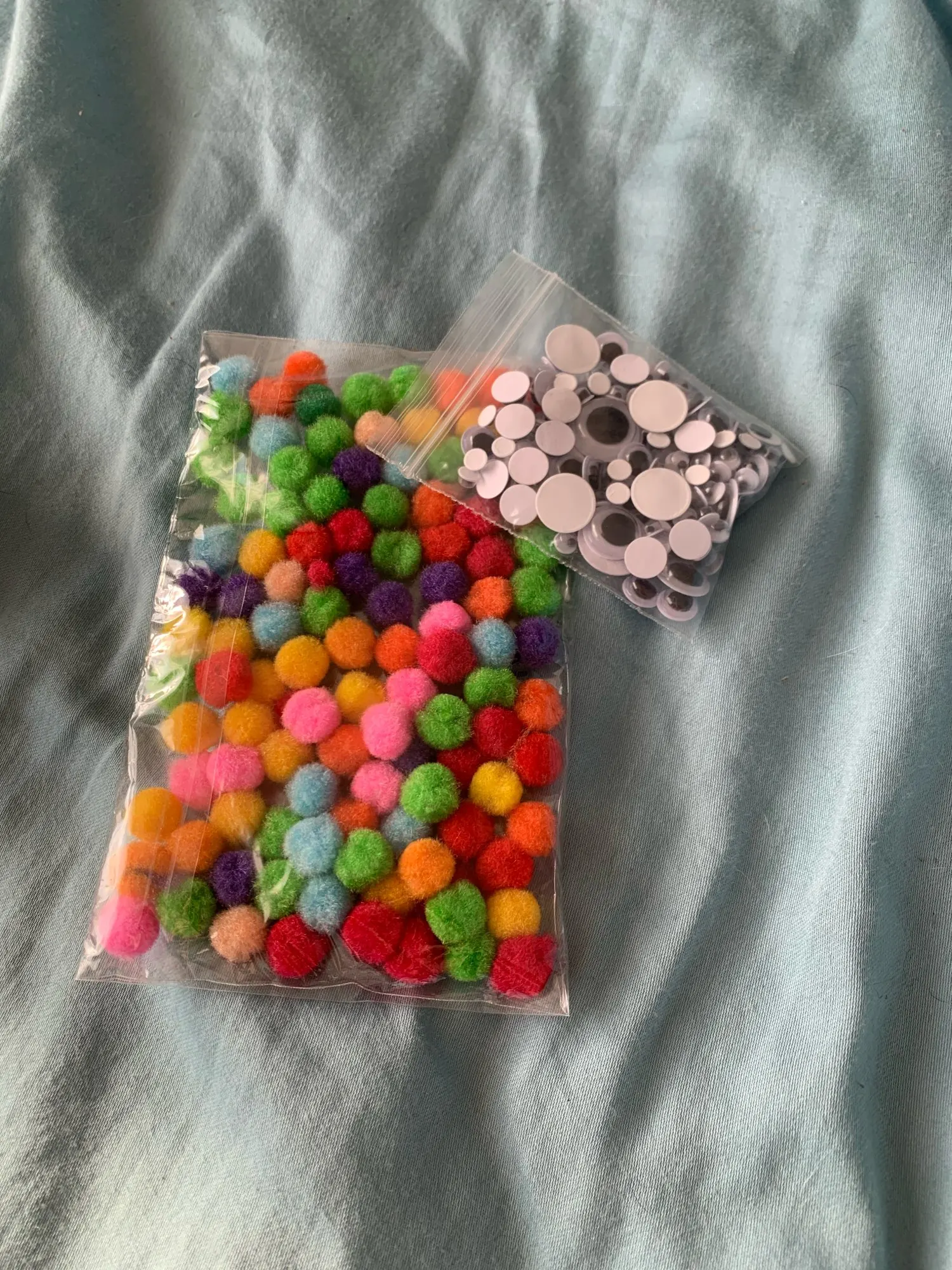 Помпонов кажется что очень мало, пакетик ~7/3 сантиметра. Мне казалось, что 100 это гораздо больше, но пересчитывать не стала