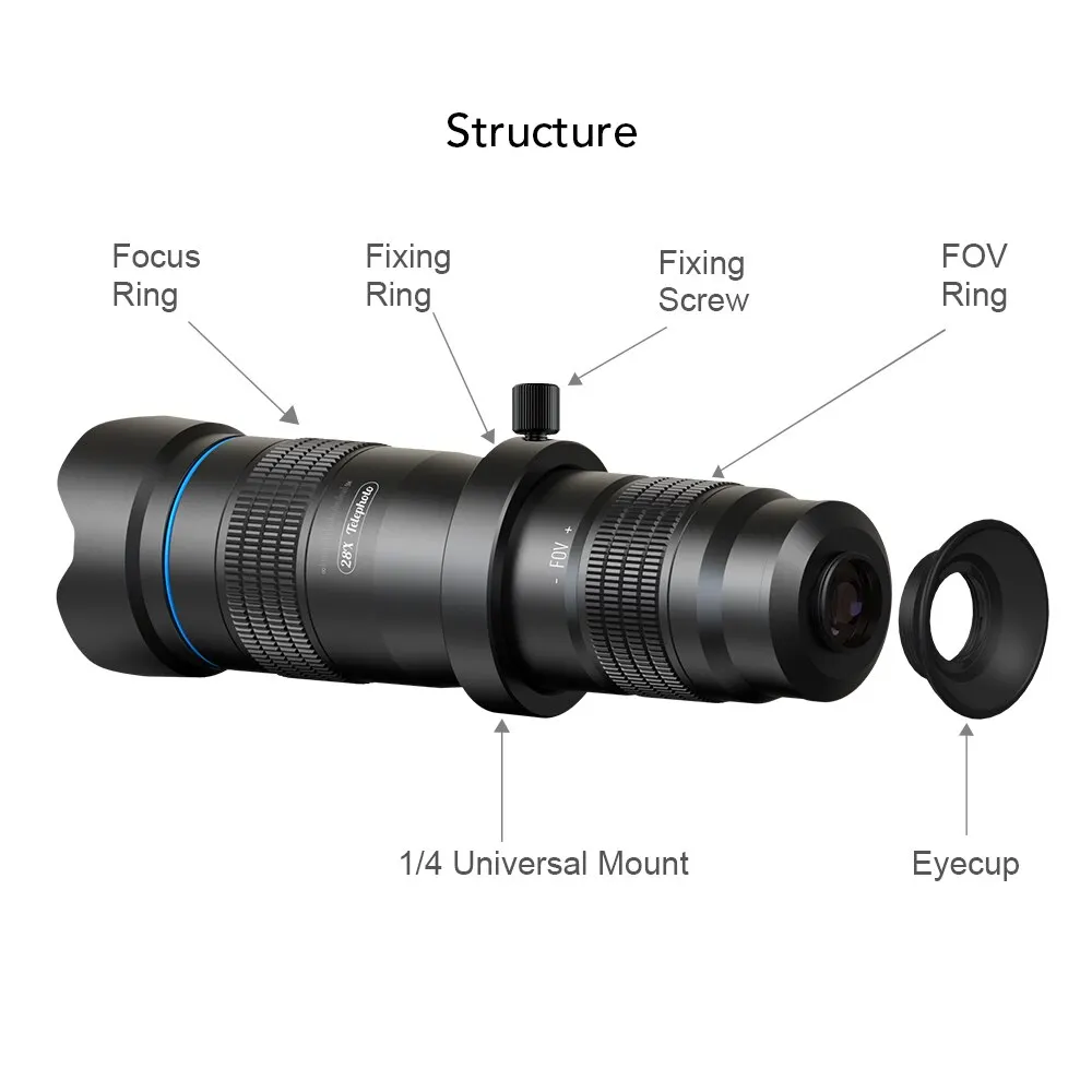 1x 28x объектив телескопа 1 универсальный металлический зажим 1x с наглазником 1x сумка для переноски 1x Руководство пользователя 1x Салфетка для уборки 1x подарочная коробка 1 штатив для селфи (на ваш выбор) 1 дистанционный затвор (на ваш выбор)