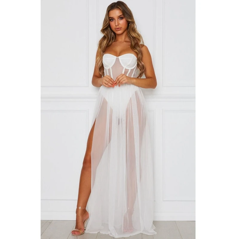 Описание -Белое прозрачное Сетчатое платье Макси -Приталенный дизайн бюстье -На косточках у бюста с Бюстье на подкладке -Прозрачный лиф с обтачными деталями -Встроенное боди -Плоский крючок и застежка на глаза внизу -Прозрачная сетчатая накладка от талии вниз -Разрезная деталь вверх по одной стороне -Тонкие эластичные регулируемые плечевые ремни -Открытая молния сзади -Платье в пол -Легкая сетчатая ткань Изготовление Основная часть: 95% полиэстер 5% эластан Подкладка: 90% полиэстер 10% эластан Размеры На модели представлен Размер 06 (XS), на ней надет размер 06 (XS) Рост модели составляет 166 см