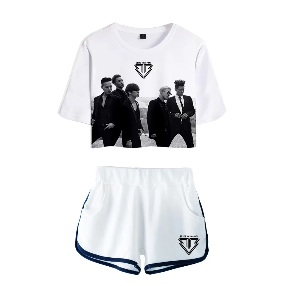 Комплект из двух предметов с принтом KPOP Bigbang, хлопковая одежда, женский спортивный костюм, укороченная футболка и шорты, сексуальная летняя одежда