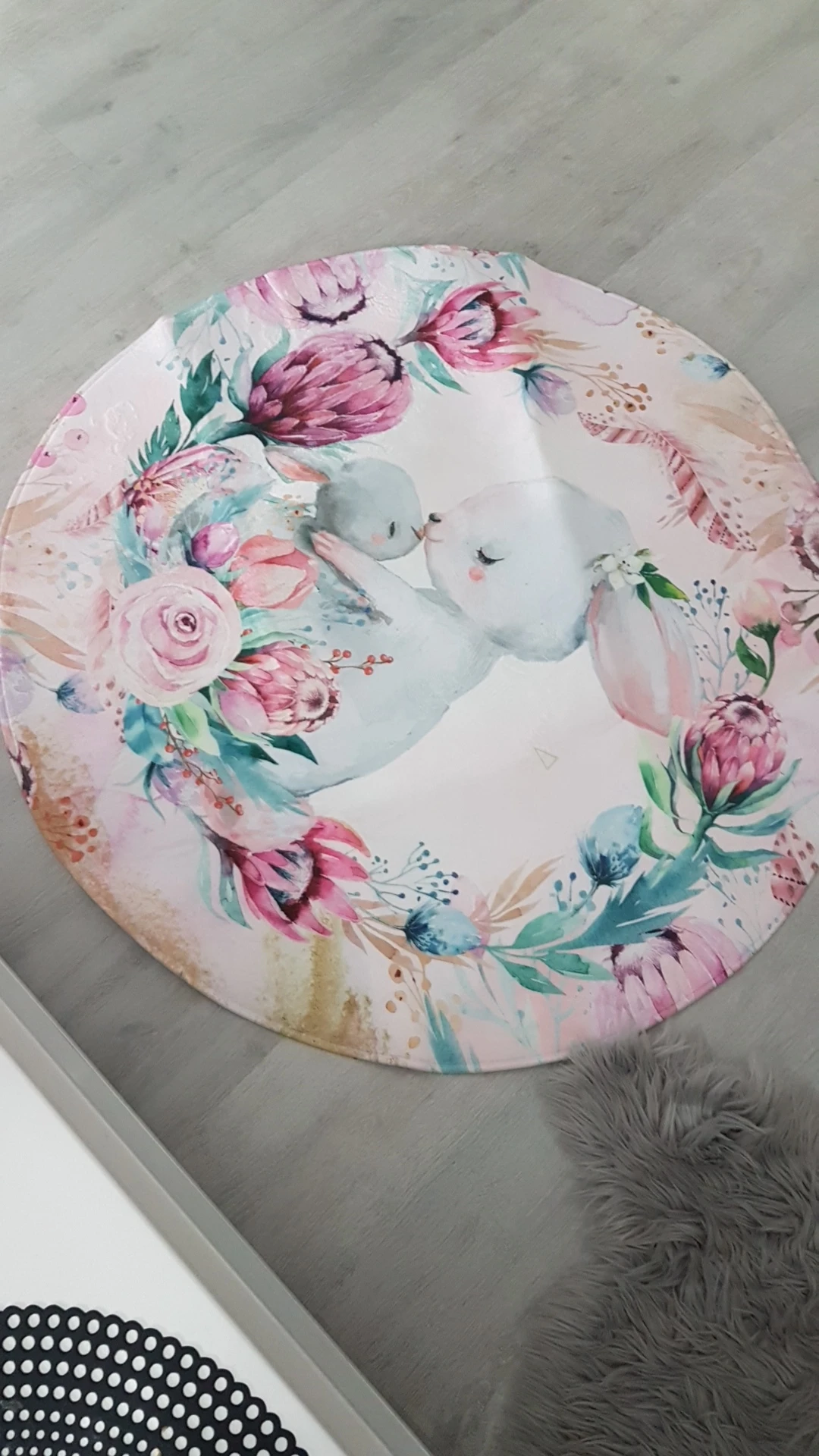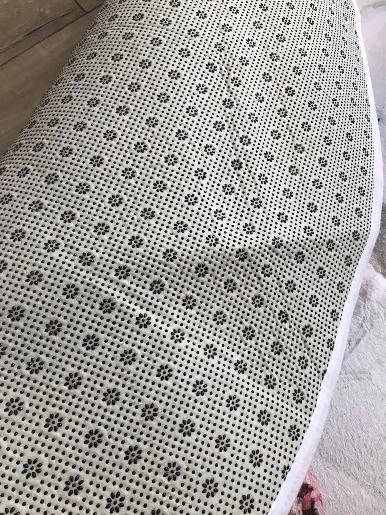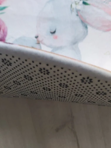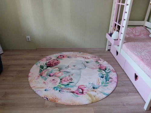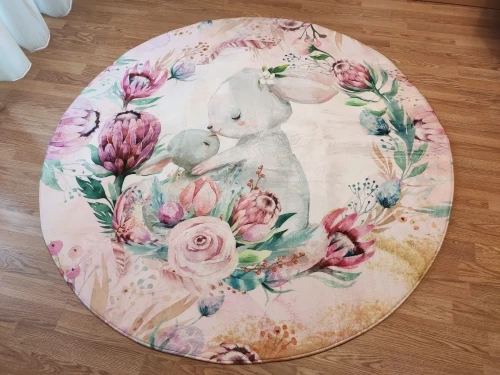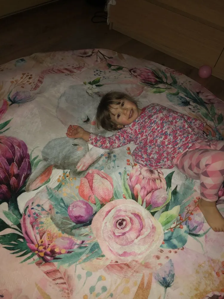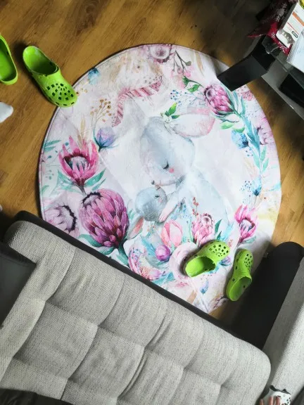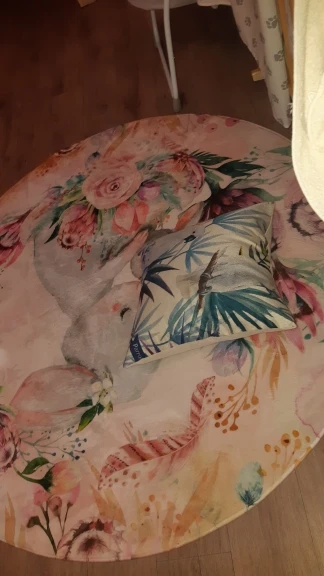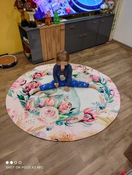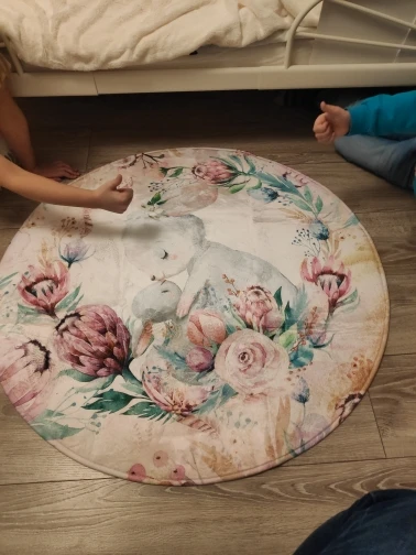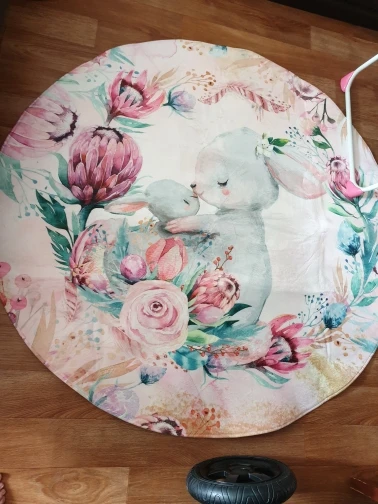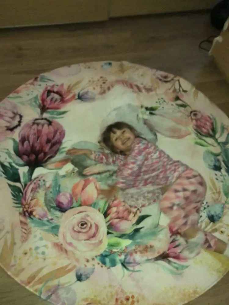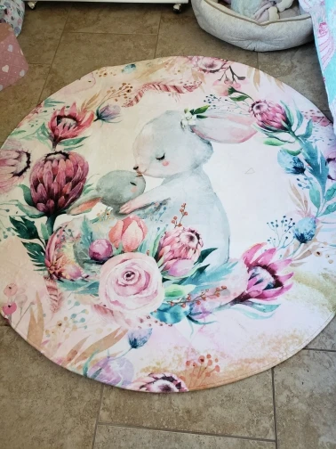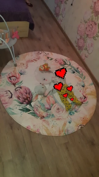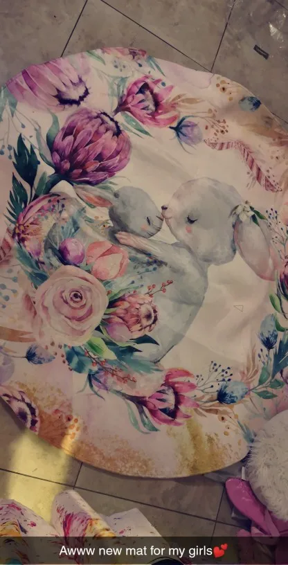 Красивый коврик, но по краям дизайн выглядит как пятно. Все очень мягкие и просторные. Он прибыл сегодня, и моя дочь уже начала играть на нем. Ей нравится .. я рад, что он более розовый, чем белый, как на картинке. Выглядит хорошо. Спасибо! Продавец.