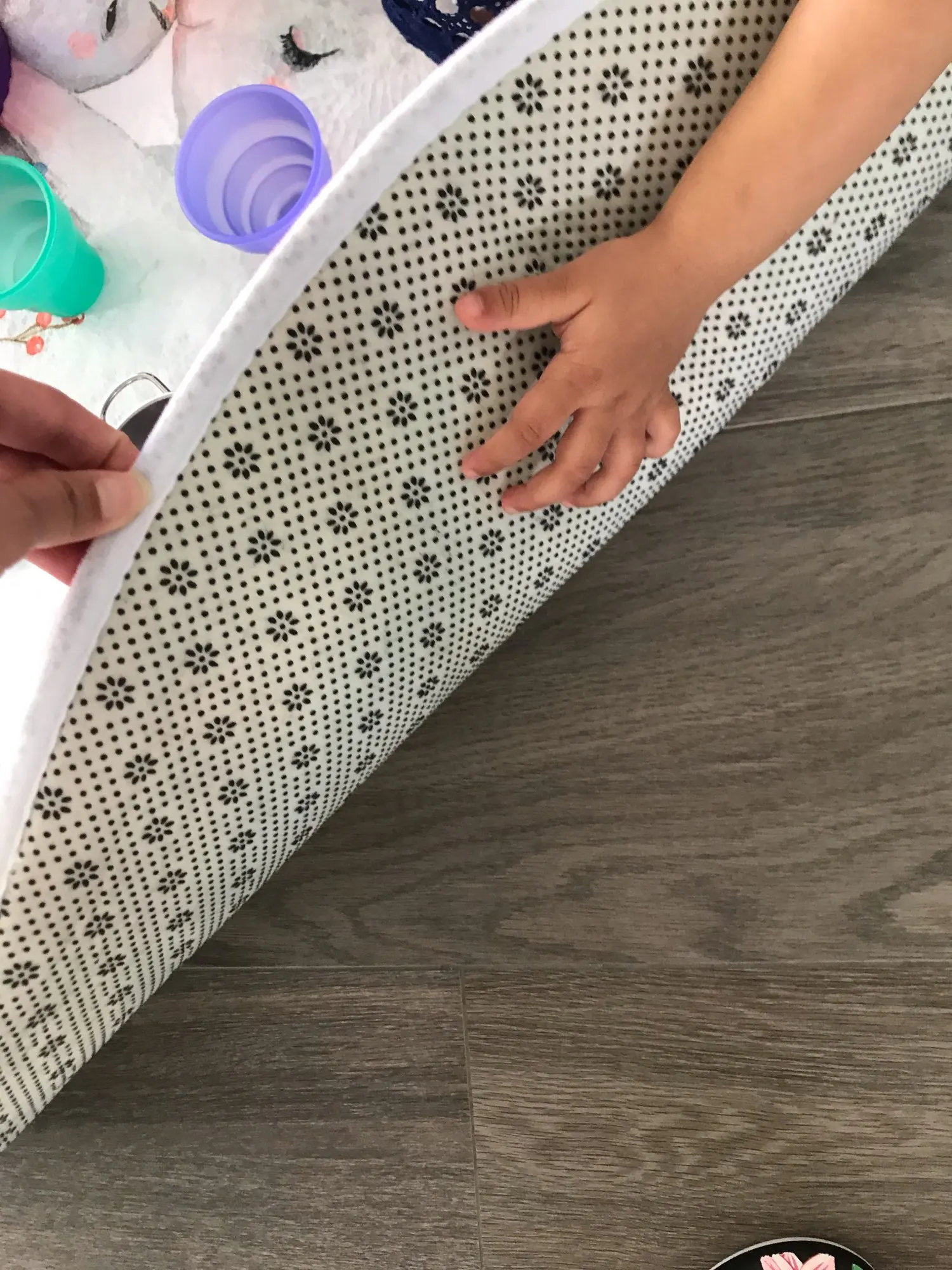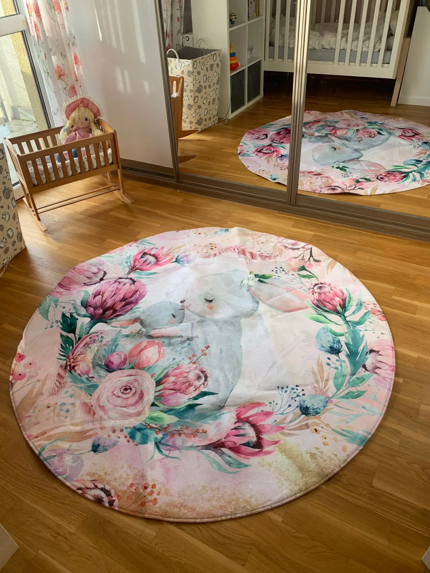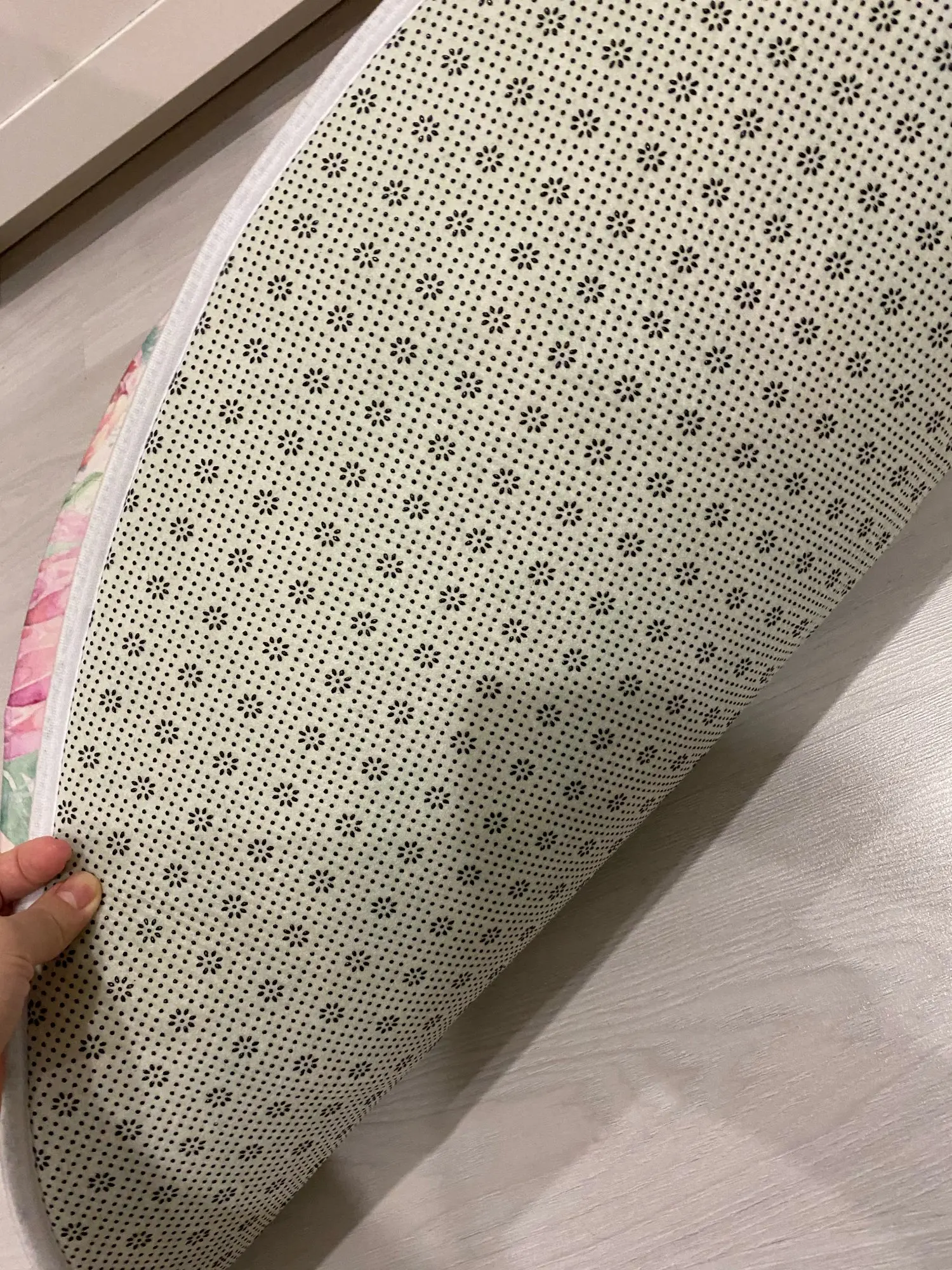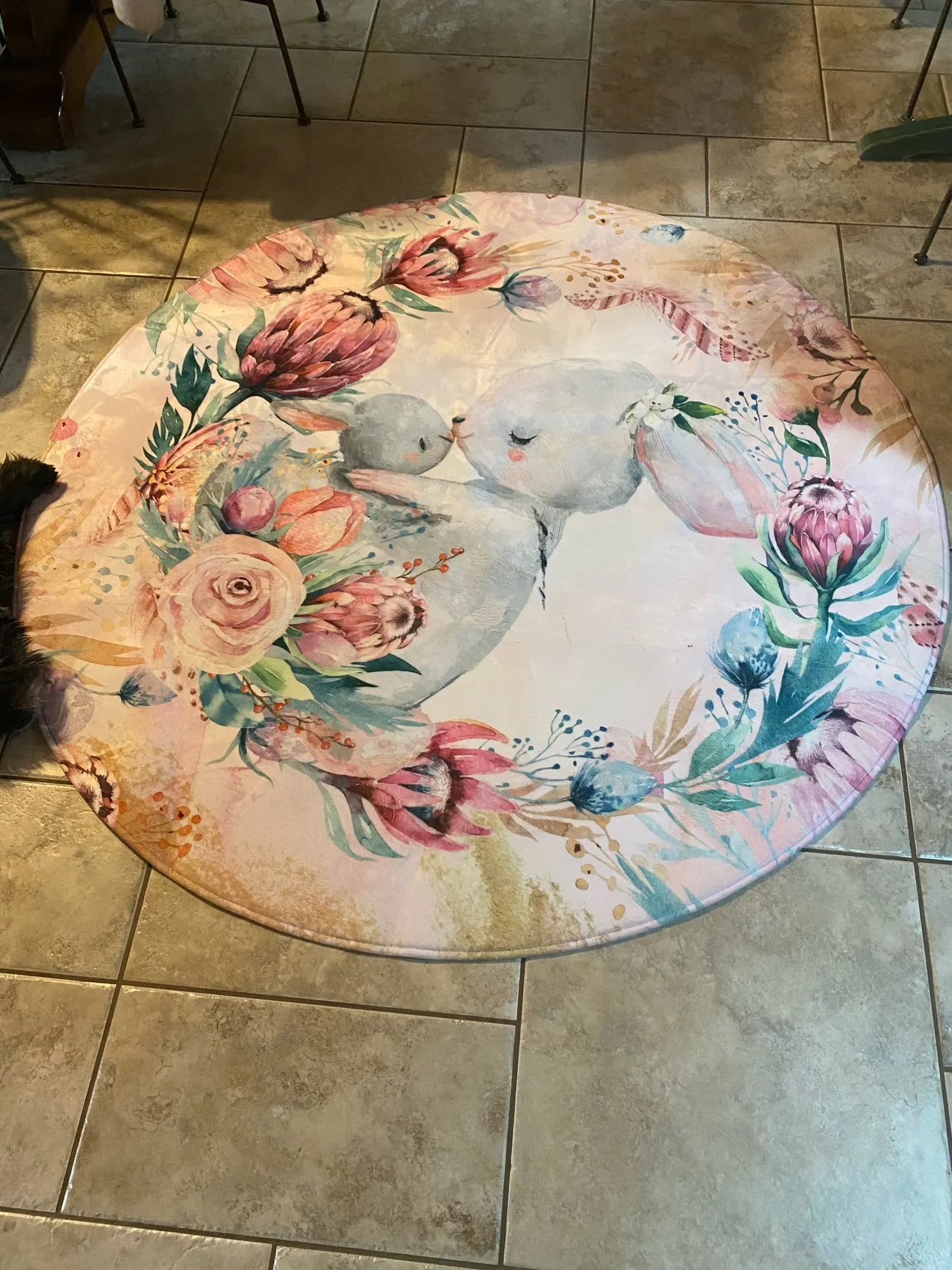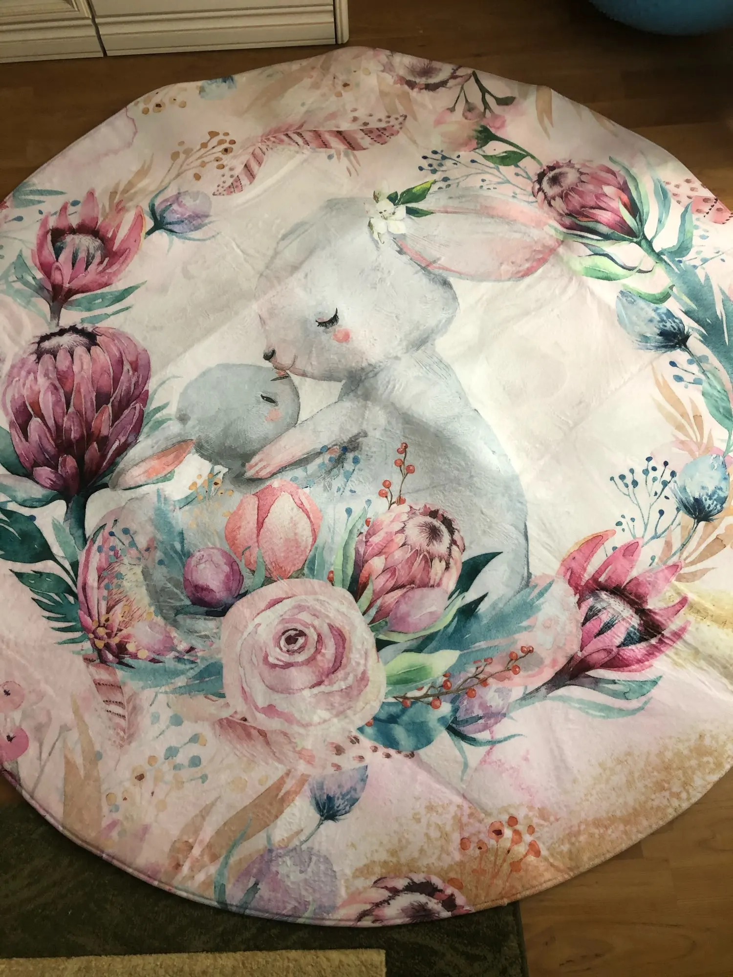 Красивый коврик, но по краям дизайн выглядит как пятно. Все очень мягкие и просторные. Он прибыл сегодня, и моя дочь уже начала играть на нем. Ей нравится .. я рад, что он более розовый, чем белый, как на картинке. Выглядит хорошо. Спасибо! Продавец.