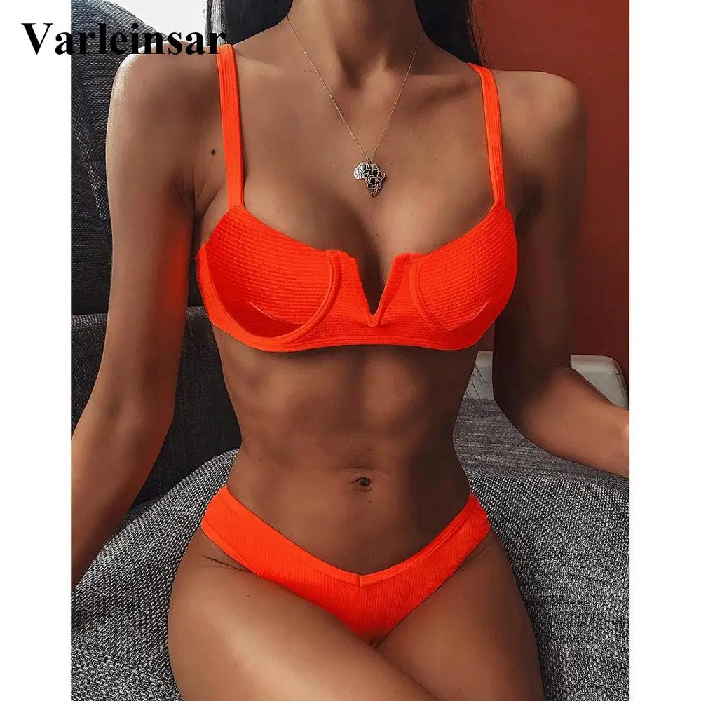 Женский купальный костюм, бикини в рубчик со средней талией, V2847