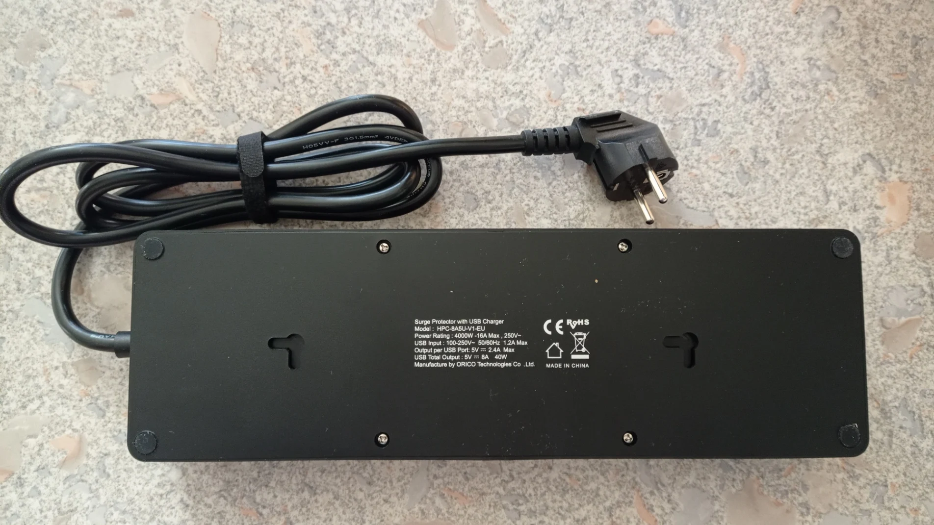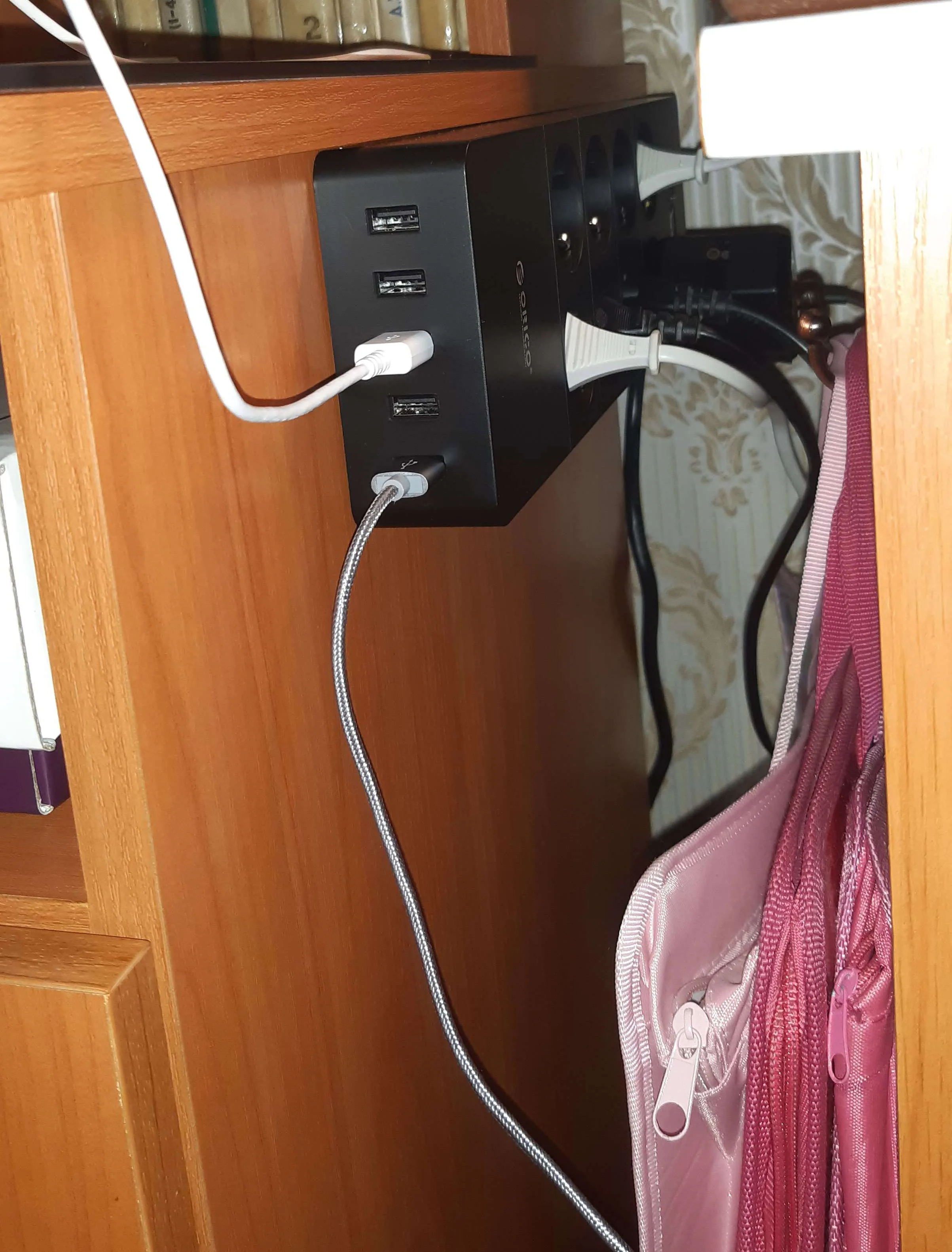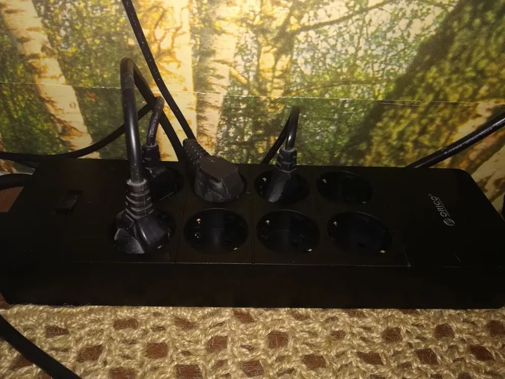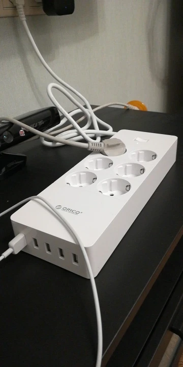 Это второй удлинитель.Первого хватило на 5 лет, после чего померла зарядка для USB, но сам удлинитель (силовые розетки) рабочие. Старый удлинитель поедет на дачу, новый занял своё место на компьютерном столе.
