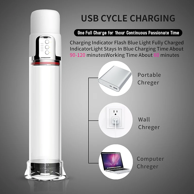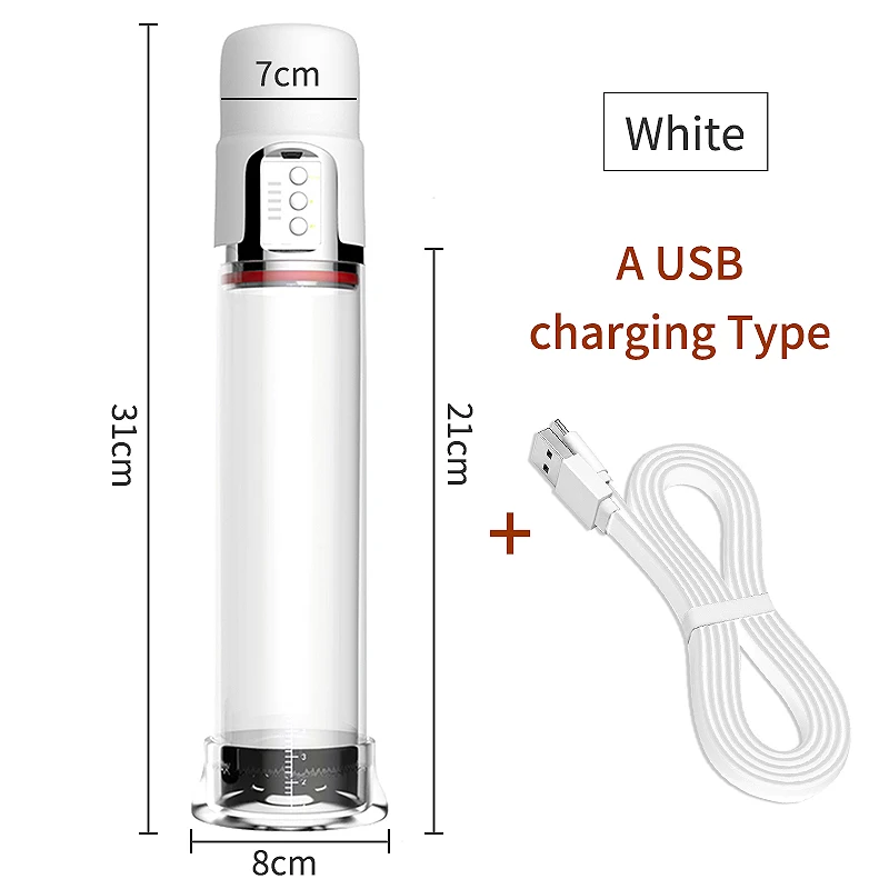 Технические характеристики:Материал: АБС + силиконПитание: зарядное устройство USB/3 * AAA батареи (два типа на выбор)Размер: как показано на фотографииМощность: 1,5 VС использованием метода:1. Смажьте внутреннюю стенку цилиндра и себя.2. Вставьте пенис в цилиндр. Цилиндр должен быть плотно прижат к основанию вашего пениса, чтобы воздух не ускользнул.3. Медленно Начните работать насос. Будет небольшое ощущение, когда воздух вытягивается из цилиндра. Для начинающих, важно начать этот процесс медленно, чтобы избежать дискомфорта. Не забудьте нажать на предохранительный клапан, если вакуум становится болезненным.4. Продолжайте откачивать/выпускать воздух, пока вы не найдете уровень вакуума, подходящий для вас: Пенис должен выглядеть распухшим, но не должен повредить.5. Теперь убедитесь, что нет выхода воздуха (если не требуется) и подождите 20 минут. В течение этого времени, возможно, потребуется дополнительно накачать, чтобы сохранить в цилиндре необходимое количество вакуума.6. После завершения работы, вы должны выглядеть толще/дольше и иметь повышенную чувствительность. Эти результаты эффективны в течение 24 часов, но вы можете испытать постоянные результаты при длительном использовании. Мы рекомендуем 3-4 занятия в неделюИспользование частота:1. (1 ~ 5) дней, 5 минут в день, до 2 раз в день2. (6 ~ 10) дней, 8 минут в день, до 2 раз в день3. (11 ~ 15) дней, 12 минут в день, до 2 раз в день4. (16 ~ 20) дней, 16 минут в день, до 2 раз в день5. (21 ~ 25) дней, 20 минут в день, до 2 раз в день6. Месяцев времени упражненийВ комплект входит:1 * трубка1 * Силиконовое кольцо1 * Дополнительный внешний аккумулятор контроллера1 * Руководство пользователя