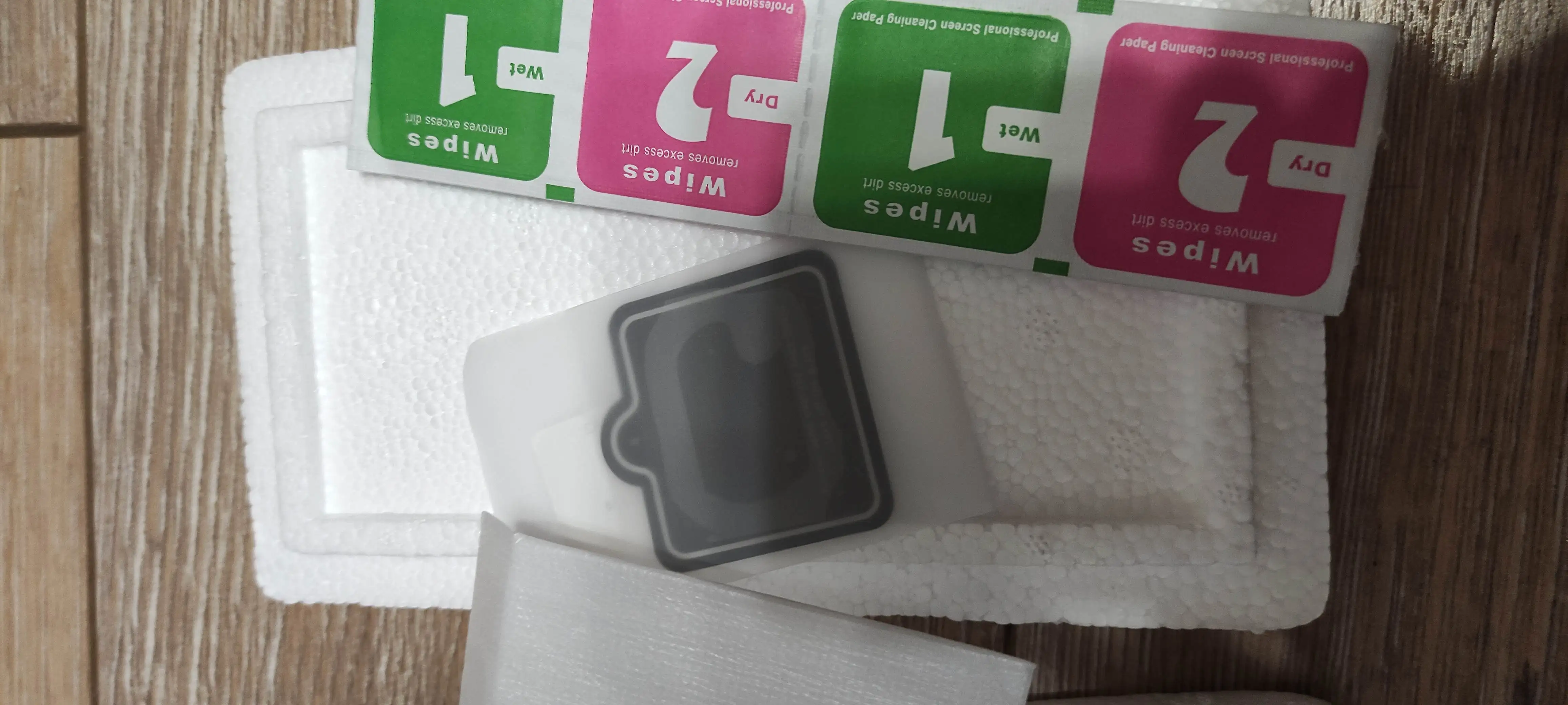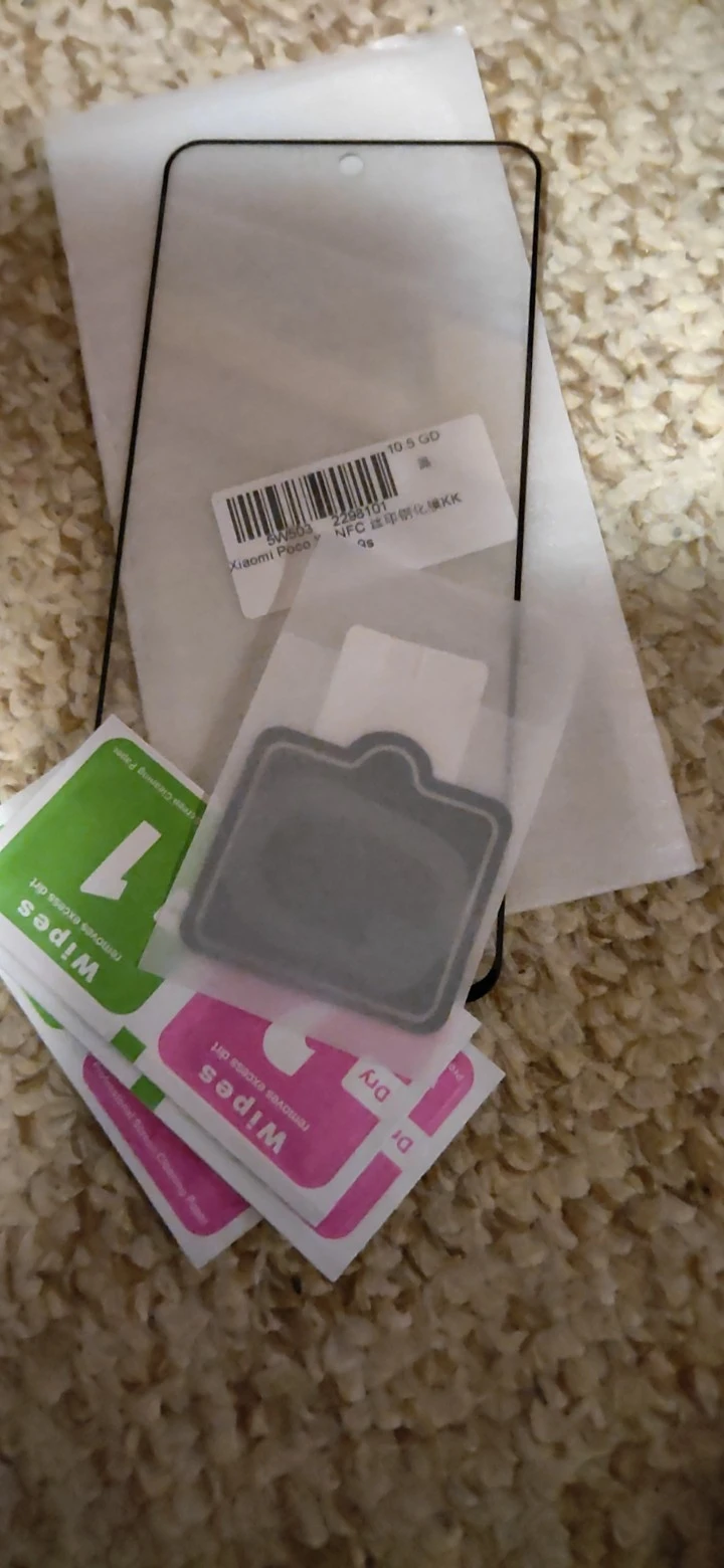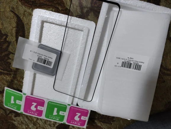 Стекло для poco x3 nfc. Не мог тут на этот комплект найти отзыв. Не клеил пока. Пенопластовая коробка со стеклом, гнущимся стёклышком или плёнкой(не смотрел) для камер и 4мя пакетиками для протирки. Дырка под камеру на большом стекле есть. По краям стекла чёрный ободок. смотрите фото