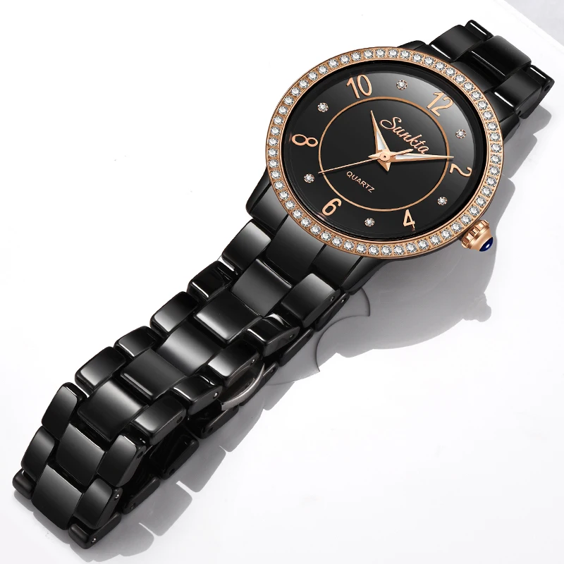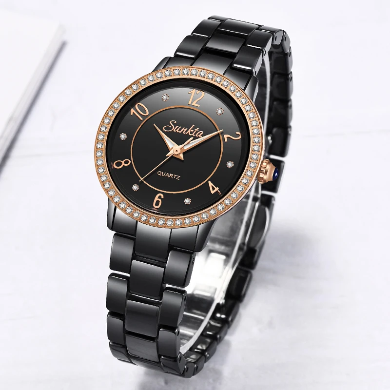 Женские керамические часы SunKta, классические водонепроницаемые часы цвета розового золота, черного цвета, стразы высшего качества
