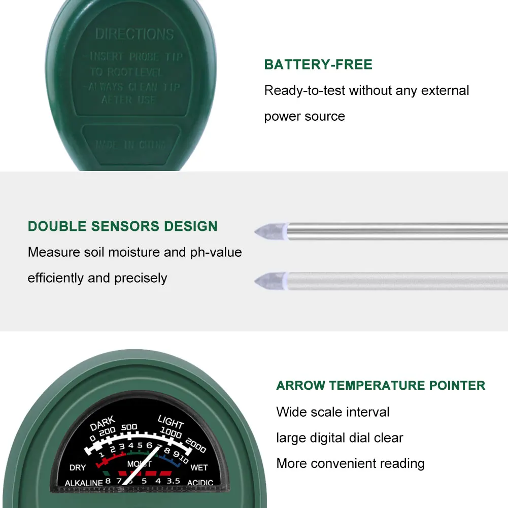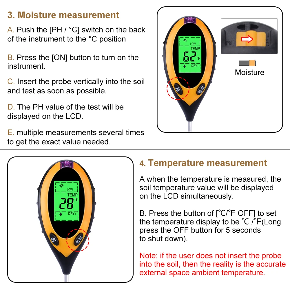 Простота в эксплуатации и портативность для переноски. Большой ЖК-экран с зеленой подсветкой. Температурный блок переключается на °C/℉. Питание от аккумулятора 9 В (не входит в комплект) и индикация низкого заряда батареи. Тестер почвы автоматически отключится через 5 минут без работы. Изготовлен из высококачественных материалов, не ржавеет и долговечен.
