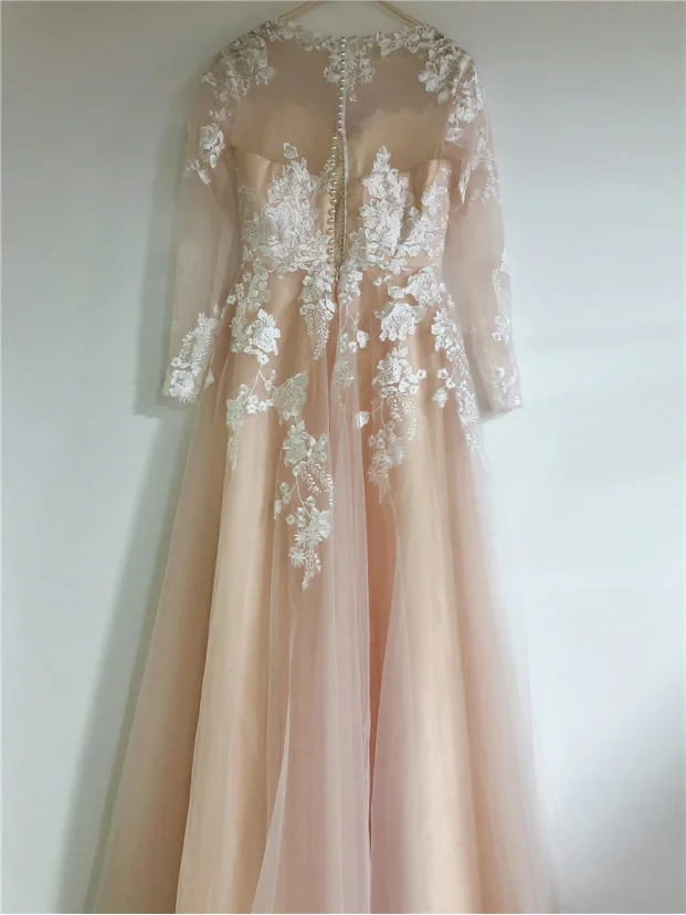 Свадебные платья цвета шампанского, трапециевидные, 2020, кружевные аппликации, длина до пола, длинные рукава, совок, Vestido De Noiva, свадебное платье, платье для свадьбы