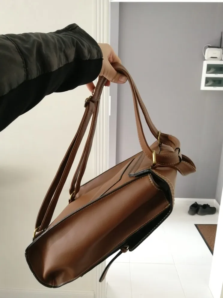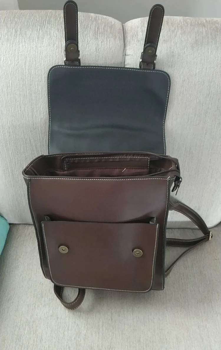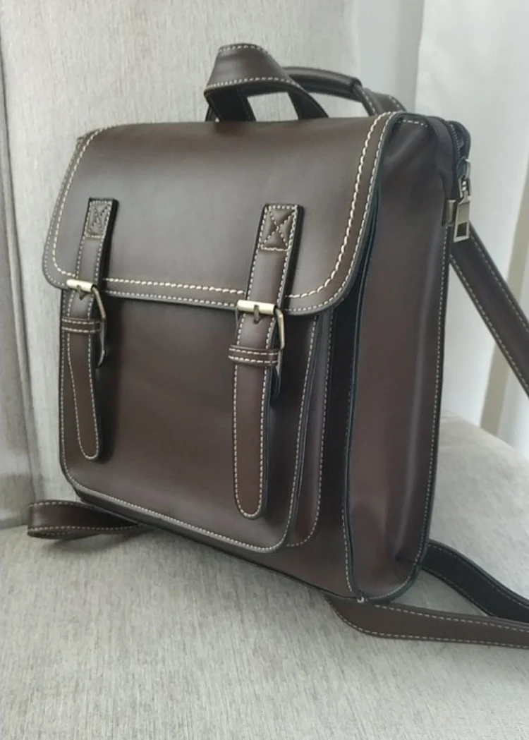 Заказ шел с доставкой из России, поэтому приехал быстро. Смотрится рюкзак хорошо, дорого. Пошит аккуратно. Кармашки внутри и снаружи. И вроде бы всё хорошо, но есть нюансы. Если положить в него учебник формата А4, он не застёгивается. Как сумку-почтальонку носить его можно только, если внутри лежит, например, книга. А если ничего изнутри не держит форму, он начинает складываться пополам по горизонтали. Ну и почти сразу отлетел один из магнитиков на застёжке.