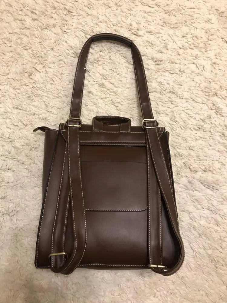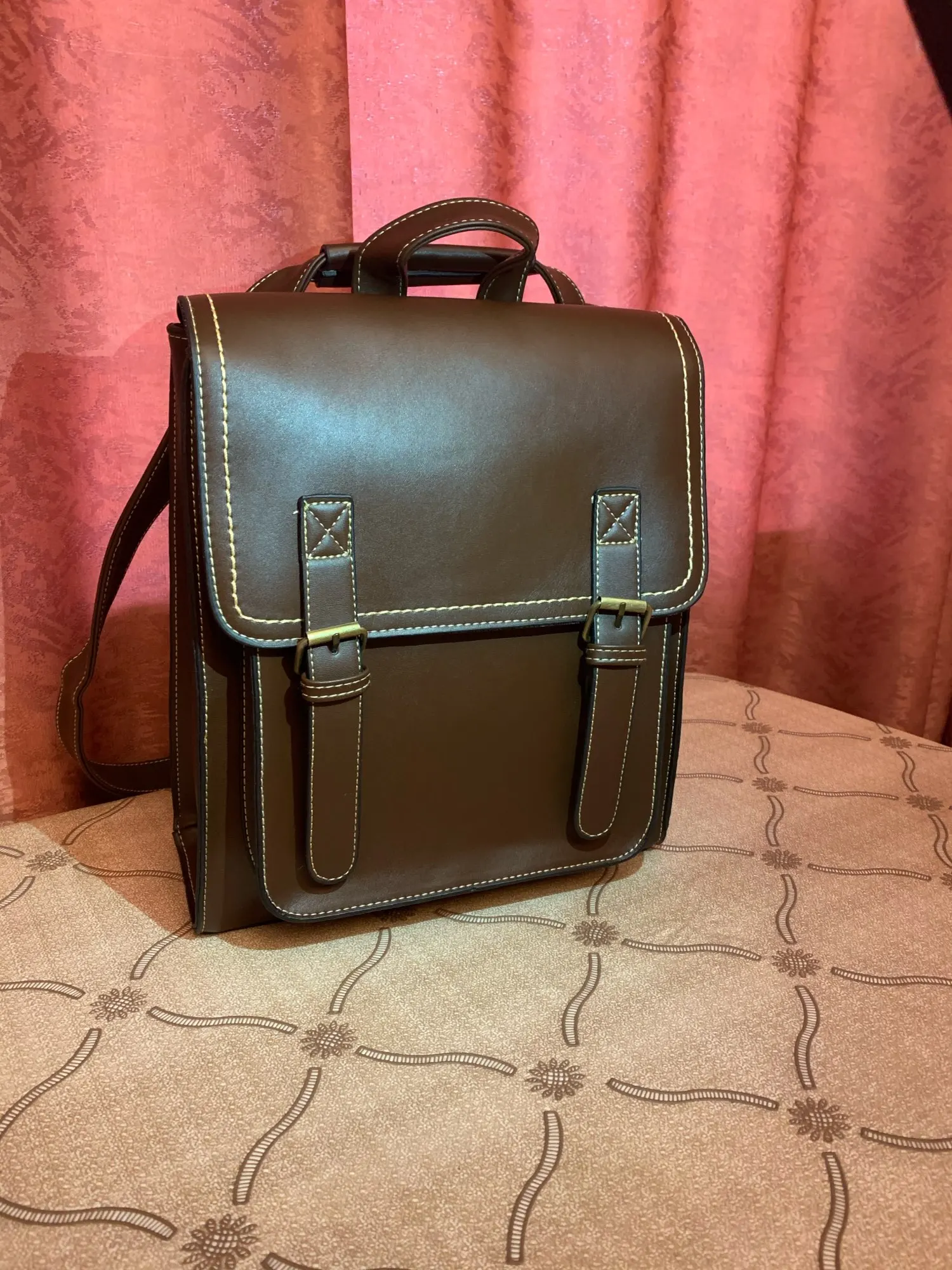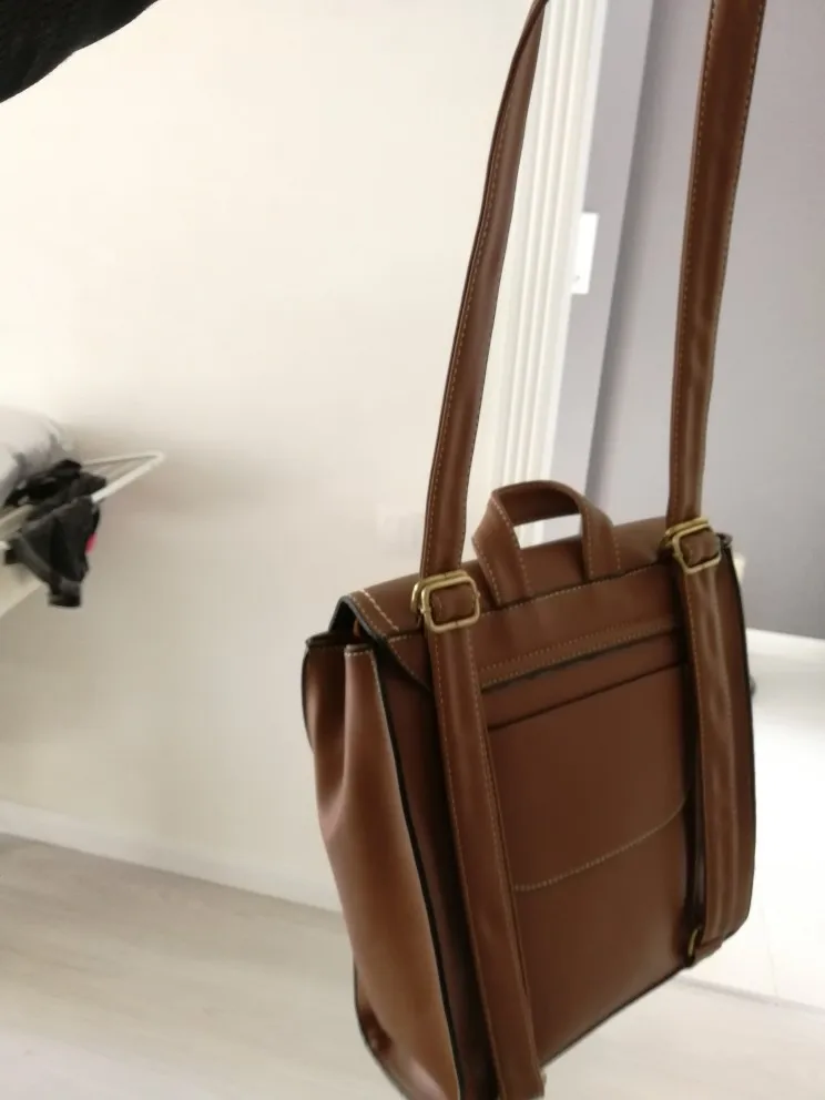 Рюкзак пришел быстро, доставка из России. Красивый коричневый цвет, ровные швы, нитки не торчат, молнии хорошие. Размер небольшой, вмещает в себя формат на пару сантиметров меньше А4, Есть небольшой карман спереди и маленький сзади, внутри кармашек на молнии и два кармана для телефона и мелких вещей. Можно носить как рюкзак и как сумку через плечо.