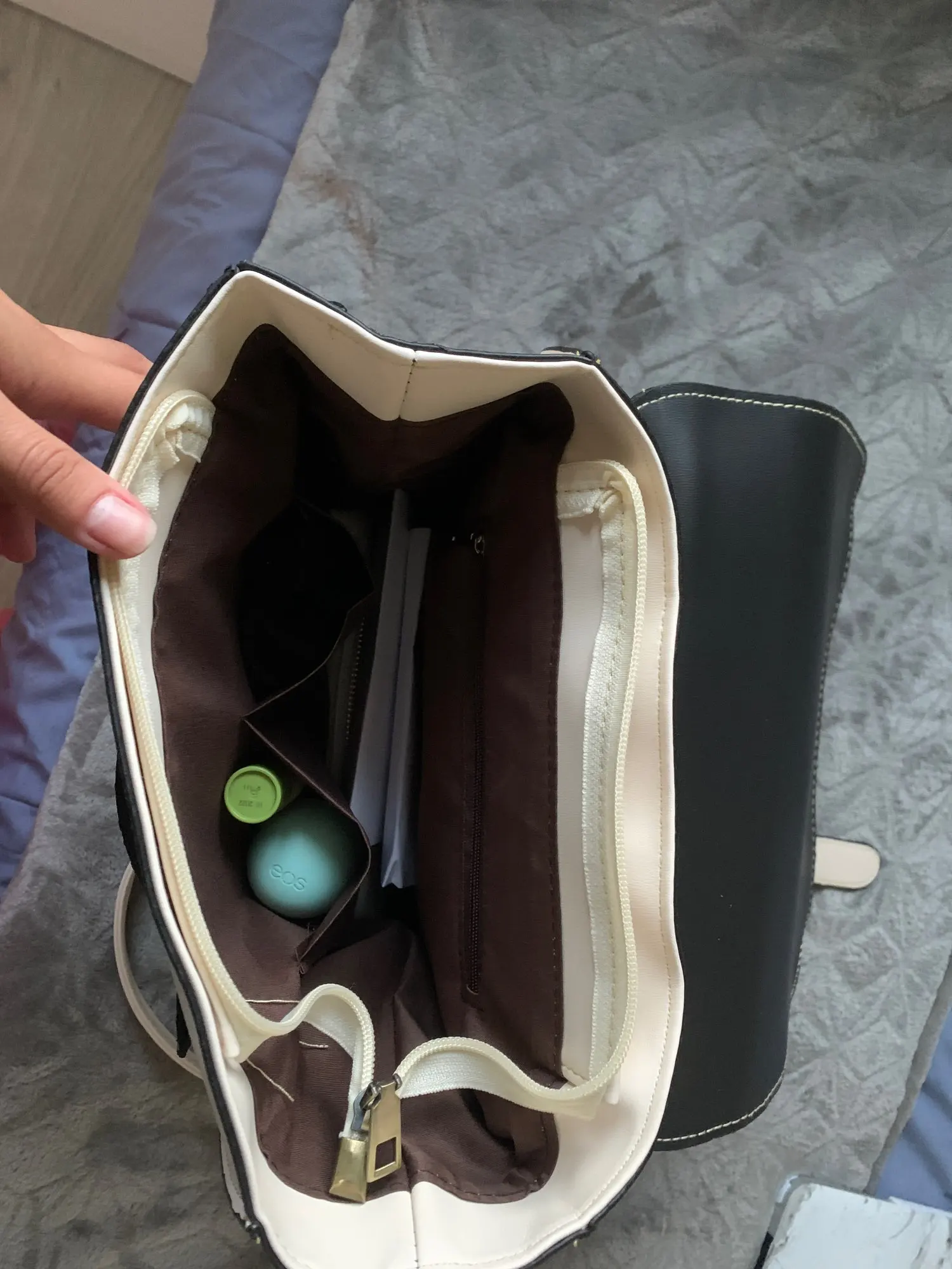 Качество 10/10, очень приятная кожа, вместительный (влезает шейкер, тетради, контейнеры с едой и многоо много всяких побрякушек), много карманов