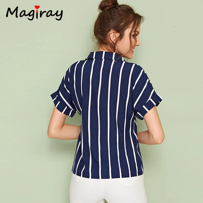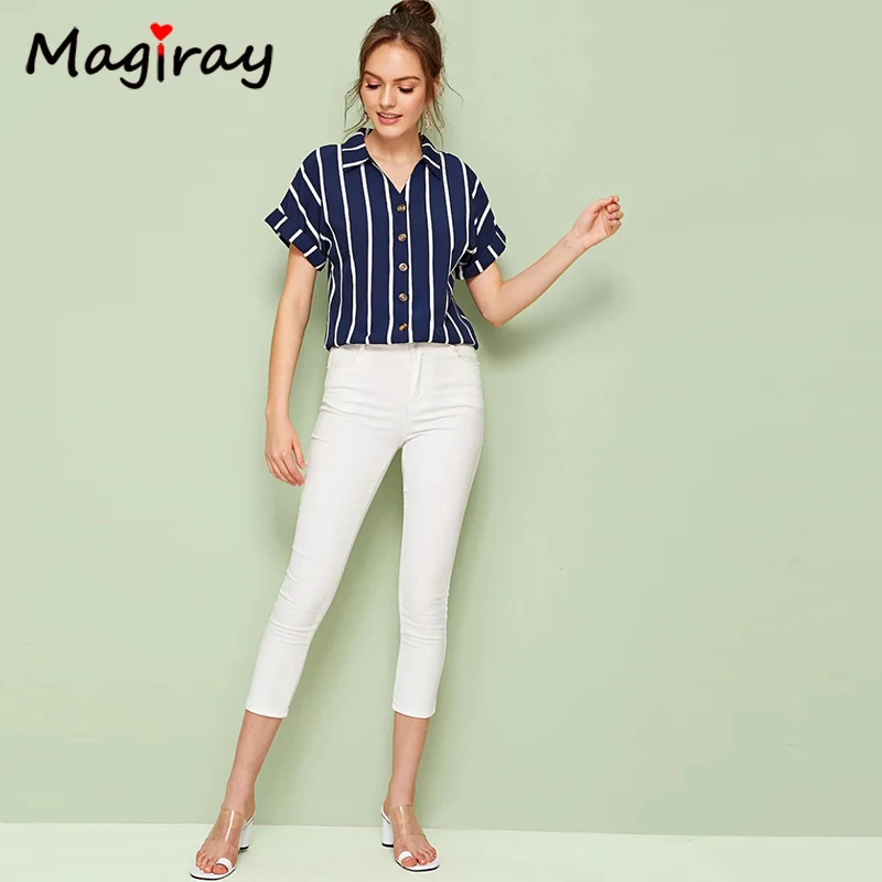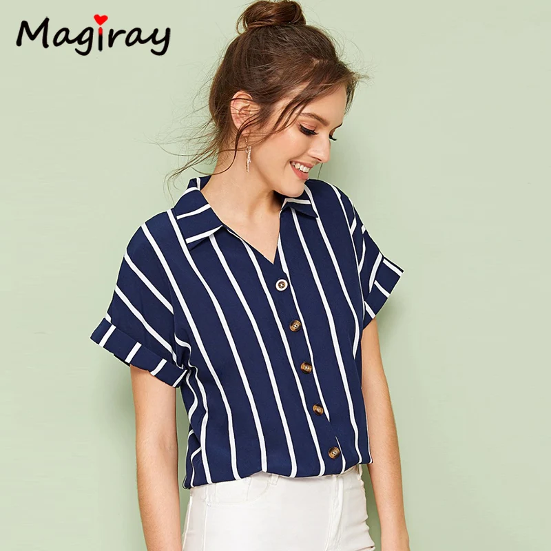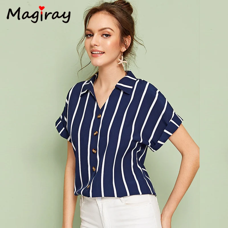 Элегантная повседневная рубашка Magriay, с воротником-стойкой и рукавами летучая мышь, белого и синего цвета, в Корейском стиле, для офиса, C210, женские блузки в полоску