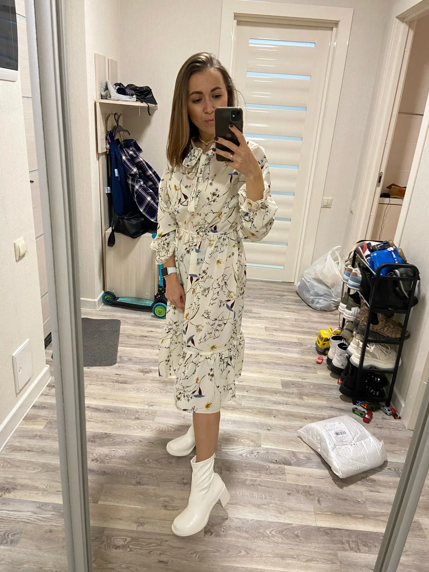 Платье просвечивает, придётся подьюбник делать. По модели норм, только на мой рост 178 см, резинка выше талии, по длине до колена.
