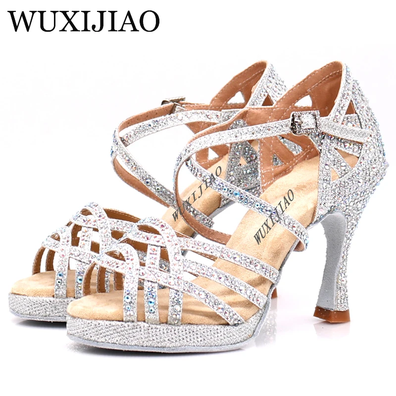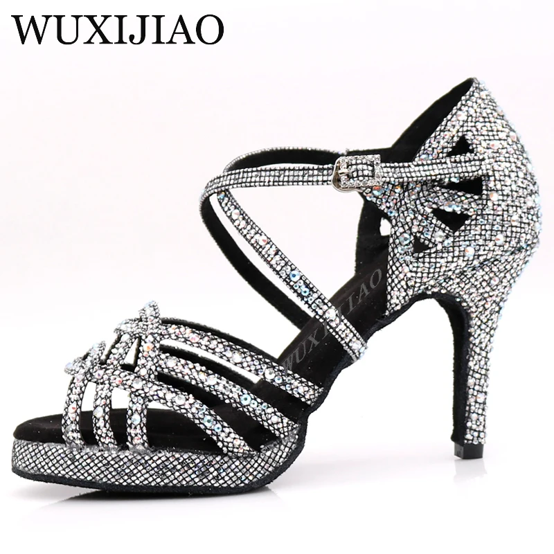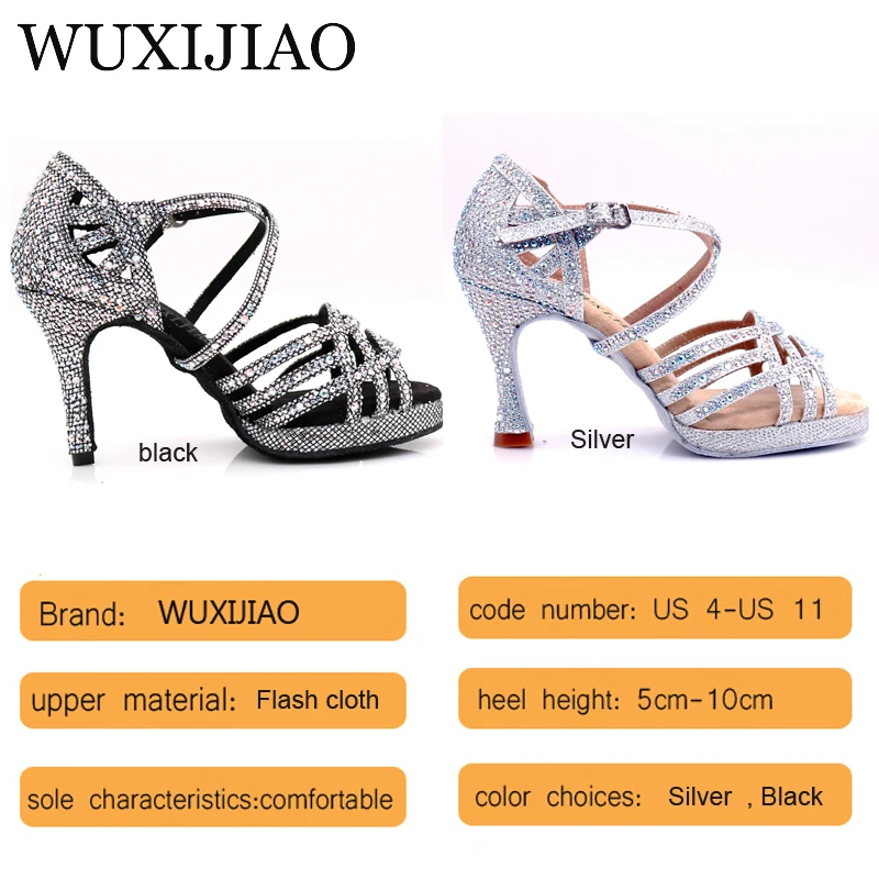 Женские туфли для латиноамериканских танцев WUXIJIAO, серебристые и черные танцевальные туфли со стразами, на каблуке 5-10 см