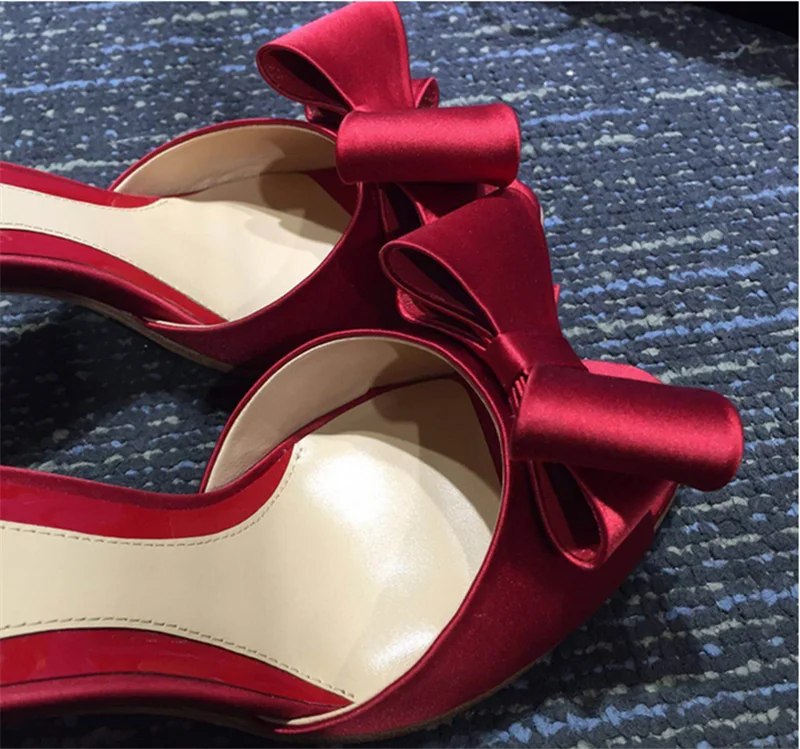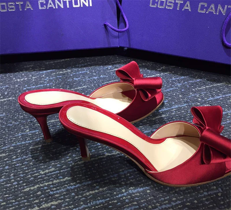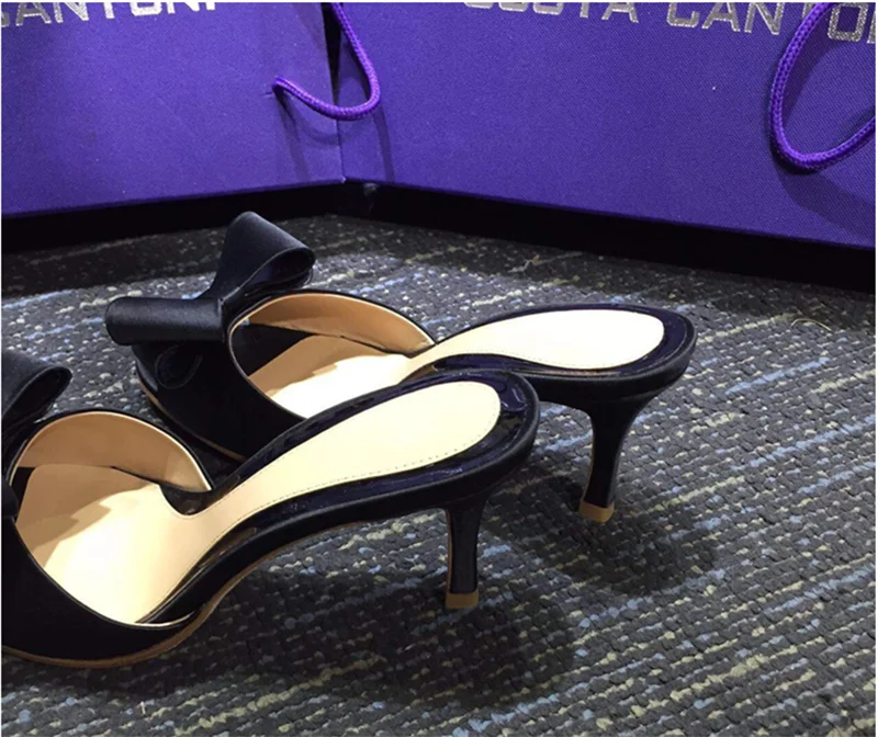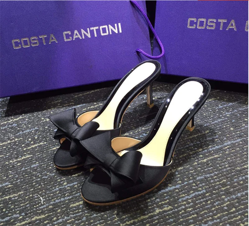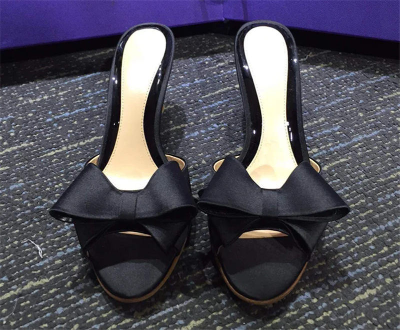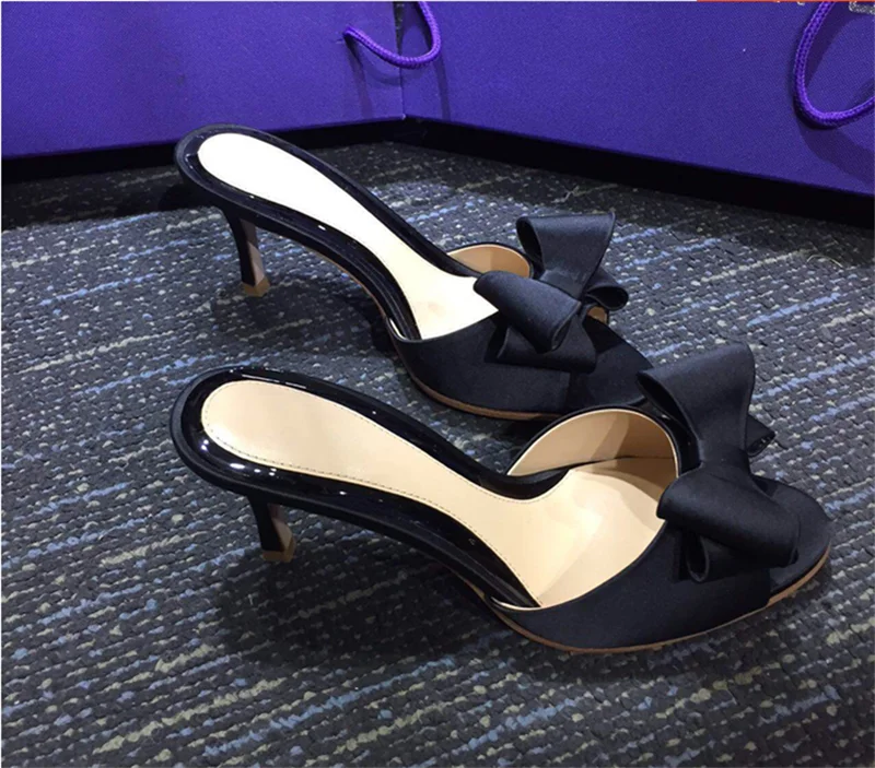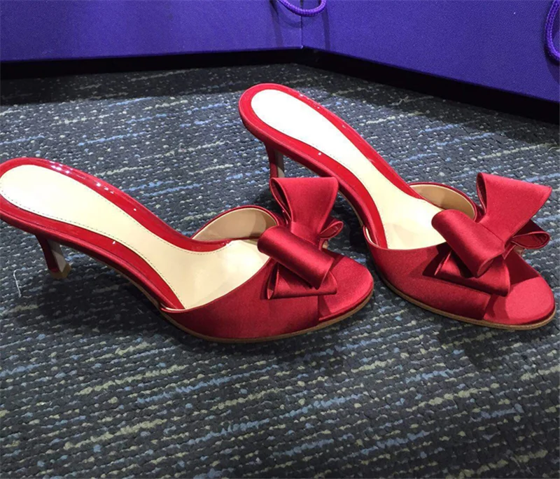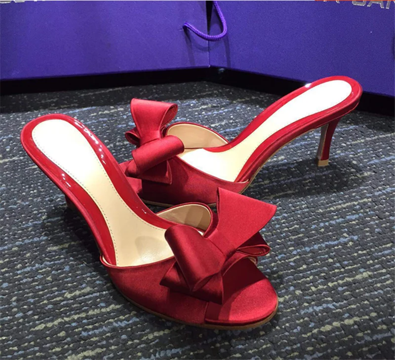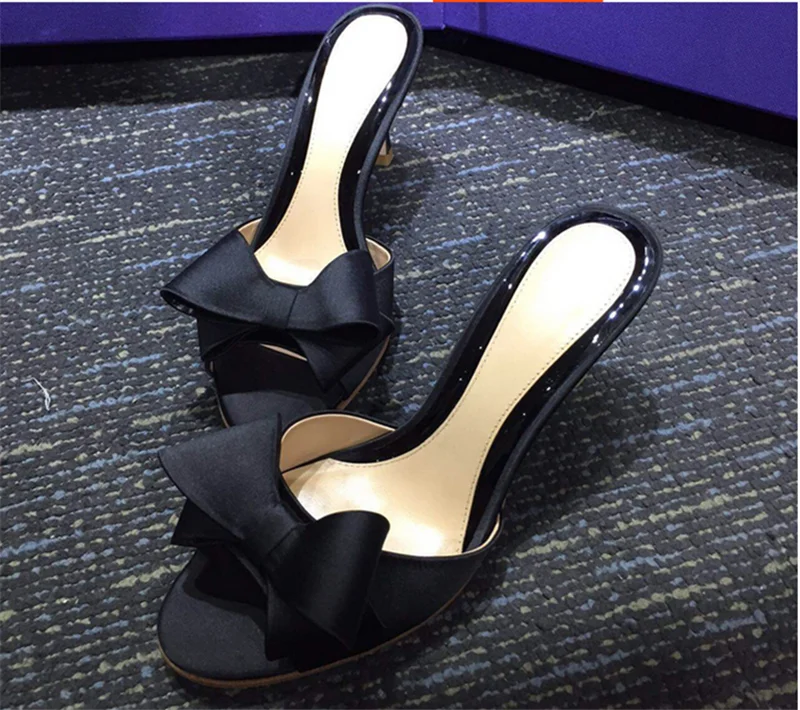 2021 Летняя обувь женские шлепанцы с большим бантом на тонком высоком каблуке мюли с открытым носком женские шлепанцы размера плюс 43 черные красные женские сандалии