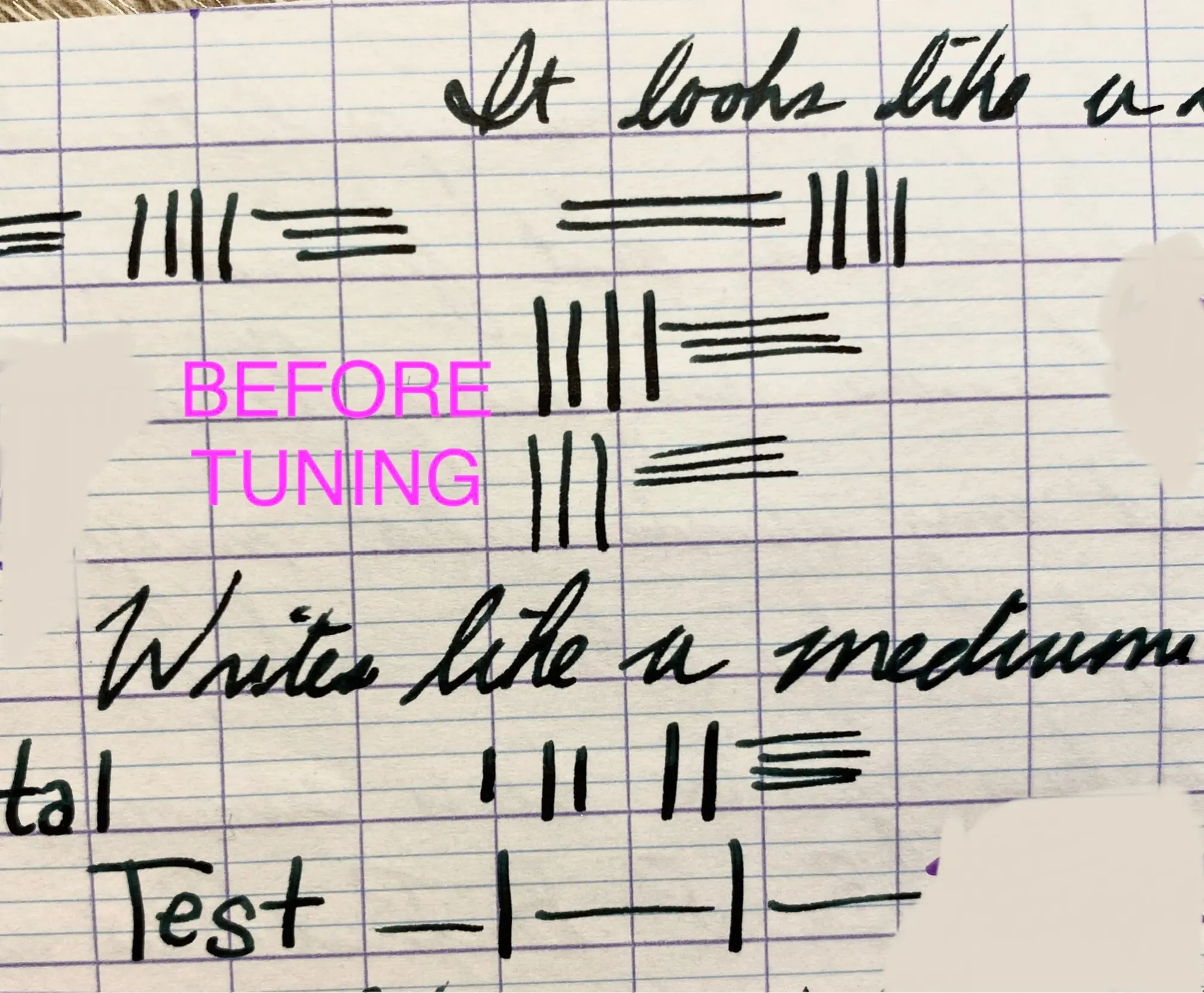 Быстрая доставка-перо хорошее, но было немного округлым, поэтому он писал как средний, а не заглушка. Я использовал немного наждачной бумаги с мелким зерном, чтобы немного настроить его, и теперь он идеален. Намного проще, чем шлифовать наконечник вниз. В целом я очень доволен им