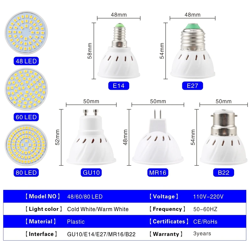 Светодиодные точесветильник почки E27 E14 MR16 GU10 B22 220 В, 4 шт., 48 60 80 светодиодный 2835 SMD, 3 Вт, 4 Вт, 5 Вт